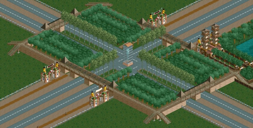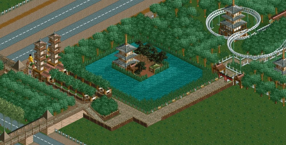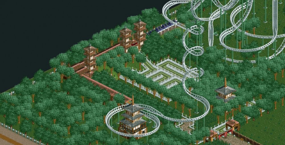 I decided to start making a park based off of the Dusty Greens scenario in RCT2, but it would be significantly different, and this is how Dust Park was born. It's divided to four different areas, that can be walked across through an air bridge. The different areas have different themes. Thus far i have made the start of one area and the central hub. The central hub with the air bridge The entrance area to the first area The first coaster of the first area, Python, if you're wondering about the type of coaster it is, i made the track with the standup coaster but put LIM-Coaster trains on it. The rest of Python So that's it for now, come back for more!