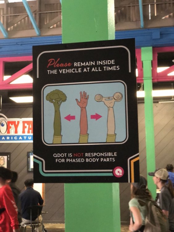 So I was out in Denver last weekend to go see a concert at Red Rocks, and during some downtime on Saturday afternoon, I made a point of checking out the park, especially given the talk of that land being taken over for real estate development in the future. I was also hoping to check out Lakeside while I was out that way, but wouldn't you know it, I missed opening day by one week. Since I didn't have much time (was heading out to see a baseball game at Coors Field with a start time of 7:00), and the park appeared to be very much on the busy side thanks to a number of different school groups coming in and taking over, I made the quick decision to grab a fast pass wristband and limit myself to the coasters and the dark ride. I hadn't had any experience with Meow Wolf prior to this, but I had only heard good things. So that ended up being stop number one. Ended up being slightly tricked when it came to the length of the line; while it looked as if there may have only been about a dozen people in line, it turns out that the queue line goes through a door to outside, where it continues around. It ended up being about a fifty minute wait, due to no fast pass access, each car only seating 4 people, and what appeared to be a number of technical issues constantly causing the ride to stop. Once on board, I settled in for a crazy psychedelic trip, and was sufficiently overwhelmed with visuals. The first room was an 80's retro overload, with mountains made out of pink vector graphics and glowing neon structures, giving the whole thing a total outrun sort of vibe. The next room started off with the vectors being engulfed in fire, before giving way to a vibrant Lisa Frank jungle nightmare scene. Then the entire thing got progressively weirder as all the creatures started mutating in the next room, and a chair made a slow motion freeze frame trip across the room only to find itself drawn and quartered by some creepy TV-headed man. Followed it up with one of the coolest effects in the entire ride, a very effective hyperspace tunnel with projections and LEDs. It all concluded in a dark room with a single light shining on an egg, but I think at this point it must have malfunctioned again because nothing was happening. I mean, though, it was pretty hard to understand what was supposed to be happening for the entire ride. That's the price of "art", I guess. One disappointing thing was that it was supposed to be a shooting dark ride, but nothing much seemed to happen or change depending upon whether you were or weren't shooting. Overall, it was a really unique experience that I'm glad I got a chance to see in person, but I wouldn't wait more than 15 minutes for it a second time. As far as the coasters went, both the Boomerang and Mind Eraser models were pretty much stock off the shelf, yet neither one of them ended up being super rough or painful to ride. You know the park was packed when both of these rides had a full queue, I'm guessing at least 60-90 minutes per wait. At $40, the wristband was definitely worth the price of purchase to skip these lines. Their Half Pipe was actually the first one of those models I've ever been on, and it was super disorienting in all the best possible ways. If I find myself laughing hysterically mid-ride, I can't help but give it a thumbs up. I ended up making my way back to Twister II for my next ride. Having had many a good experience with Knoebels' Twister, I was looking forward to checking out its' Coloradan cousin. I enjoyed myself (short of its first turn after the drop, which sent me slamming my ribs into the side of the car), and it was definitely worth riding, but I still rate the one at Knoebels much higher. Then, my last ride of the day was on Sidewinder, which brought back some serious nostalgia for me, having grown up with the Lightnin' Loops out at Great Adventure. Again, it was fun enough as a quick one-time hit, but it's kind of weird to look back and see how far coasters have come since this ride was the big bad thrill to beat all others, and now it's just kind of tame. That backwards airtime though! Always a pleasant surprise. Overall, I was glad to have visited, but I don't really have any overwhelming urge to go back and visit, even if I find myself out Rocky Mountain way again in the future. I hope if they do end up moving the park to another location, they're able to invest more and modernize. Some pics! I can't think of many places that actually have you ENTER through the gift shop. Just because you keep repeating something doesn't necessarily make it true. If the font and color choices didn't give away the weirdness in store... ...then this mural on the back of the building definitely should. Or this sign. What's QDOT? "Quantum Department of Transportation", apparently. They may not be the best rides out there, but they're undoubtedly photogenic. Built wilder the second time around? You mean at Knoebels? Still, it's cool to see a coaster with an NFL stadium as its backdrop. Ride the lightning! I was underprepared for how awesome this little thing ended up being. Surprise sleeper hit of the trip! -