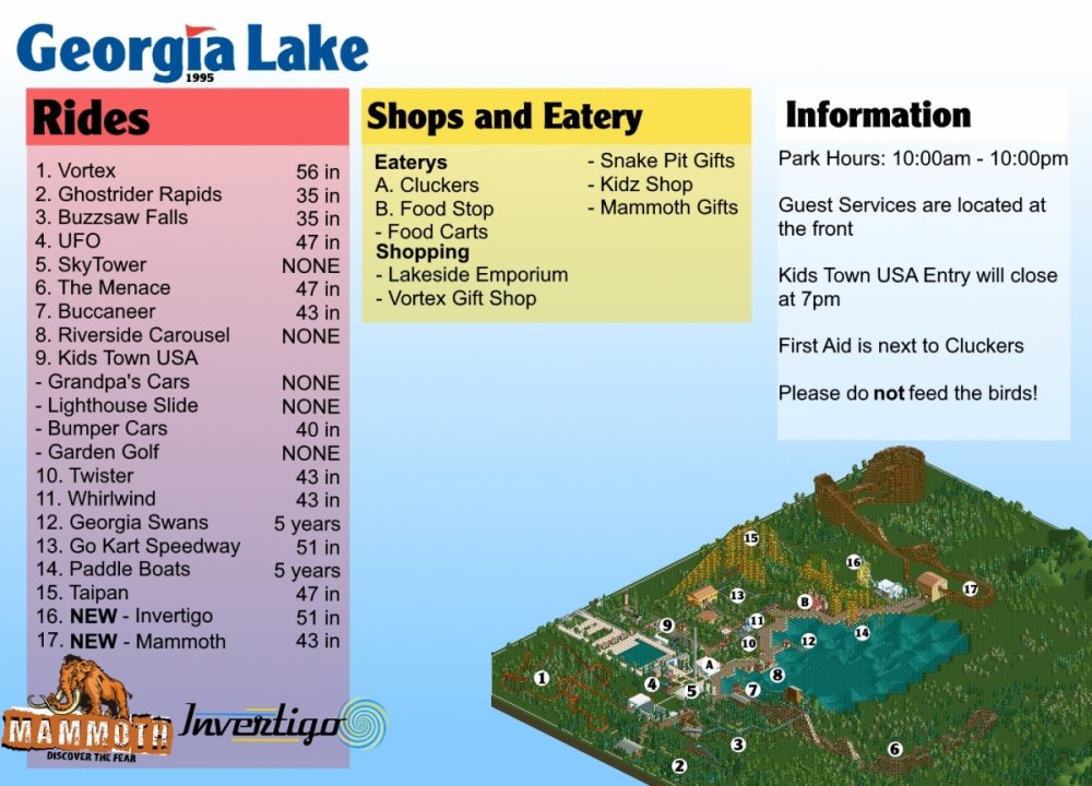 Yes it is opening day for Georgia Lake 59th seasons first new roller coaster, Mammoth! Invertigo was going to open today as well but unfortunately it was ready in time to open but we still got to experience the now biggest coaster in the park, Mammoth. Let me tell you it is an exceptional ride, very tall, very fast and very intense. Mammoth is definitely in my top 3 wood coasters I have ever ridden. Inside the park most of the ride can't be seen because the lift hill is blocking the view. I did manage to get photos of the layout when we where given a backstage tour to get photos of this beast. Now lets look at the photos from today! SCR14.BMP Its good to be back at Georgia Lake SCR16.BMP Thought I would mix things up by entering through the other entry today. SCR17.BMP It did start raining for the first half hours but then dried up for a perfect day. SCR18.BMP I had a quick ride on Taipan as it had a short line. SCR19.BMP SCR20.BMP SCR21.BMP I just realised that they had covered up underneath of the boardwalk! It looks so much better now. SCR22.BMP They also added paddle boats but they weren't open today. SCR23.BMP And this is what we have all been waiting for... Mammoth and Invertigo! The plaza looks beautiful. SCR25.BMP Invertigo looks great, really bumbed it isn't open yet, but that's what you should expect with a prototype ride. SCR28.BMP But I hopped onto Mammoth for the first time right away. I really like to pre-lift hill section. SCR29.BMP The slow climb up the lift hill gets the adrenaline pumping! SCR30.BMP Then you fly into the first drop and it was incredible, especially in the back row! SCR31.BMP Here's a shot of the main portion of the ride. SCR32.BMP You hit a MCBR and drop into a final helix. SCR34.BMP and then fly into the brakes, what an amazing rollercoaster! SCR35.BMP Invertigo did end up testing but that's as far as it got to opening. SCR37.BMP Once we had a couple more rides on Mammoth we headed over to the parks original beast, The Menace. SCR38.BMP It is still and insane airtime machine. And that is it for today, I did grab a park map on the way out for you guys. See you next time!