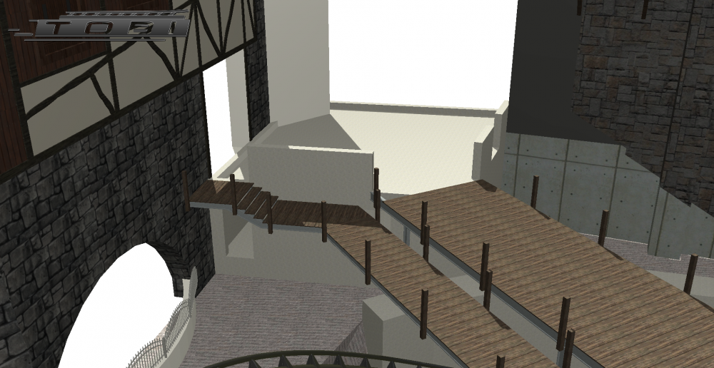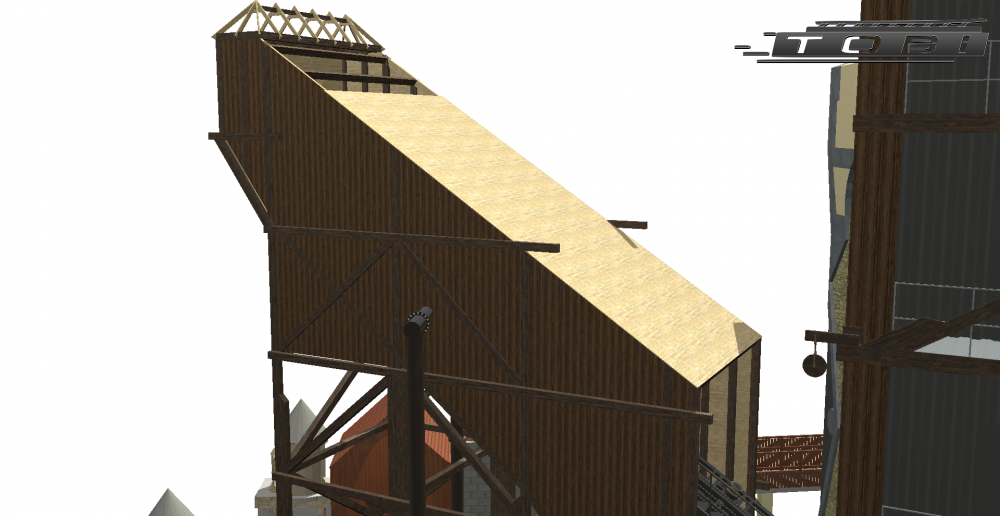 16. More building site updates from Tobi's model on Phantafriends. The building enclosing Raik's lifthills is almost finished. The wood has been darkened. Right next to the new bridge that connects Klugheim to the China area they have built another narrower bridge. Not sure yet why. Both bridges go on to the roof of Raik's station. Also steps from the roof going down into the station have been put in. I assume this might be the exit? Two concrete blocks are also on the roof no one seems to know what their purpose is yet. Lifthills almost fully enclosed.