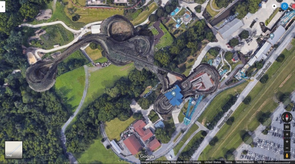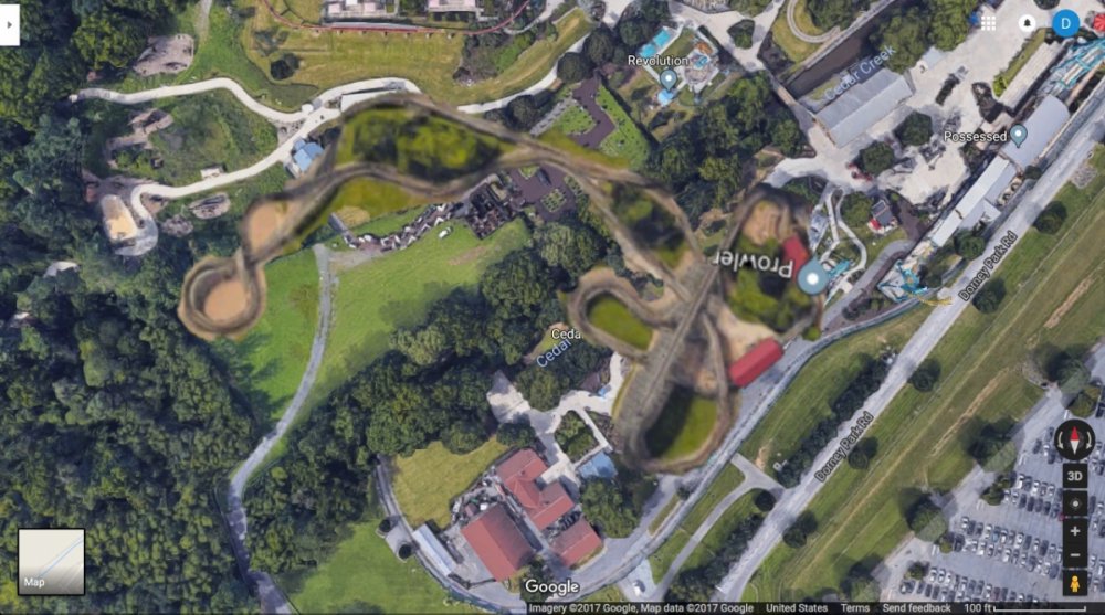 With the closure of Stinger, I think the park needs to move the Cedar Creek Flyers to the little plot of concrete where the Chance Carousel used to be. Remove the pavilions/ Urgent Scare and Dino's Alive and put a GCI down there (also using the Grave Walkers land). Just for fun, I Photoshopped Prowler and Renegade into that area to see how something like this would look. Prowler Renegade