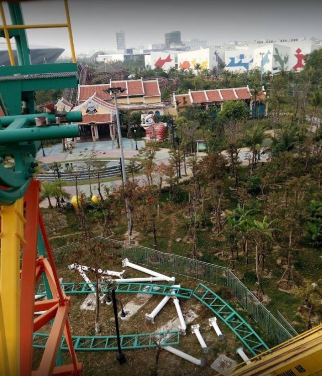 Time for a bit of an update and a refresh for this thread as the park is now installing 2 new Intamin Coasters replacing the two Premier ones from Hard Rock Park. If you already know the histor First up Sun World Da Nang Wonders is the new name for what was Asia Park. Located in the city of Da Nang in Vietnam this park arrived into the enthusiast consciousness when they bought almost all the old coasters from the failed Hard Rock Park/Freesyle Music Park in the USA. For the purposes of this post I'm going to refer to them using their (better) Hard Rock Park names Led Zeppelin headed to another Sun World resort in Ha Long Bay while this park installed the mine train and the roller skater first and then after being open for a while went about installing the two Premier ride installations from Hard Rock. The first was the unique ferris wheel coaster Maximum RPM! which the park repainted called Paradise Falls. They also installed Slippery When Wet the old Premier Single Rail Coaster and called it Highway Boat. As far as anyone can tell the park never got these rides open. Despite a full on electrical reworking of Paradise Falls the rides never ran for the public. In the mean time the park bought, built and opened Queen Cobra a brand new Vekoma SLC. However around March last year it seemed the park had given up and removed both of the Premier rides. Quite what became of them I have no idea but by June only footers were left for both of the Premier coasters as can be seen here. (Paradise Falls was bottom left and Highway Boat was halfway between that and Queen Cobra at the back) Then word came through that Intamin had been hired to replace both coasters for the 2018 season. And the Intamin Reference list released in January this year pretty much confirmed the park would be receiving a Family Launched Coaster and a Vertical Lift Suspended Coaster. Now come the start of February it seems the first Intamin is now in. The Family Launched Coaster has taken the place of Paradise Falls and interestingly uses most of the footers left behind by the Premier ride. The top down layout is essentially identical but with complete changes to the track profile and shaping. As of yet there is no sign of the Intamin vertical lift suspended coaster but I imagine it will follow a similar plan, Using the old footers of Highway Boat but radically altering the layout. And with Highway Boat there's quite a lot of scope for that. Everyone follow that? Any Questions? No? good..... phew.