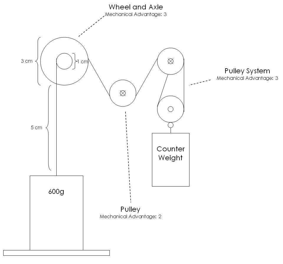 Here is a simple machine I designed for a science project. The objective is to lift a 600 gram soup can by using the least amount of force. The entire machine needs to fit in 1 cubic meter.