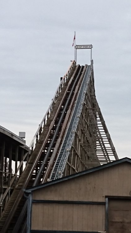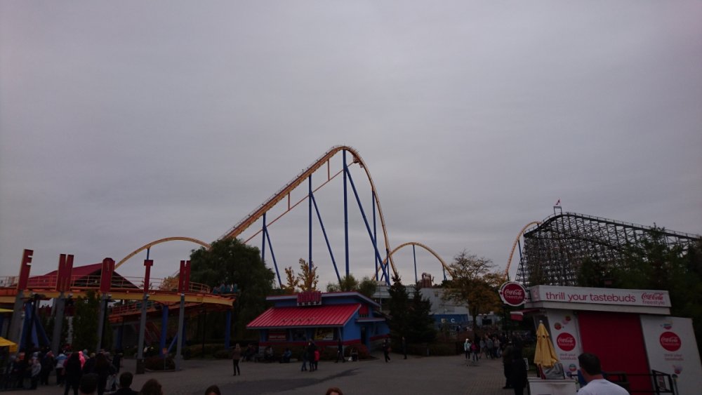So yesterday morning, the girlfriend and I decided we should go to the park, as it would definitely be our last chance for the year. We didn't hustle out the door to get there for opening, as we didn't expect the park to get too crazy on such a cold day; I think the highest temperature reached around 9-10 C (50 F). So we made a nice big breakfast of BLTs and scrambled eggs, watched an episode or two of the office, then bundled up in a couple of sweaters, grabbed some gloves, and hit the road. We got to the park around 11:30 or so (it's a 35 minute drive for us), and while plenty of people were showing up at the same time, the parking lot was well under half full. Once in the park we headed straight for Leviathan, hoping it wouldn't be too full of a line, which luckily for us, it wasn't. Seriously, this line never went behind the station any of the times we checked it out, and our first wait was 10 minutes, max. We got on somewhere in the middle, I think 3rd or 4th train, as we have great rides on this no matter where we sit. We were shivering before we even went down the first drop, but I was pumped, I love that "Oh shit" moment cresting the hill. The ride was great. I was expecting it to feel sluggish or something in the cold, but it definitely DID NOT feels slow. By the end of the ride, I could barely see, my eyes had watered up so much from the cold wind our faces. It was such a great ride that we just swung right back around for another short wait, this time getting to jump ahead a bunch because they needed two riders. We got seated second from the back, and this was even better. Seriously, I love that drop in the back, just wild. An epic climb to start the day. After our two rides on Leviathan, we decided to do something we'd been putting off for a while: Wild Beast. Earlier in the season, we got the absolute shit kicked out of us on this ride. It was pretty startling, as we'd ridden this a dozen or more times in 2016, and while we had some rough rides, never anything so bad as at the start of 2017. Seriously, that's what we felt like after riding it at the start of the season. I'm pretty sure we must have been in a wheel seat that time, which I wouldn't have thought of at the time. So we made sure to sit in the front seat of our car, and away we went. Honestly, it was much better this time, and it was quite an enjoyable ride. It was rough in the way you expect an old woodie to be without being painful. We were glad to have ridden it again, as it was always a regular part of our roster before this year. We'll keep giving it a chance next year. Not quite so epic a climb. Next up was our favorite flat, and really, one of our favorite rides overall. This beauty right here. Seriously, we love the HELL out of Shockwave. Even when they don't shake up the ride cycle, you don't really get the same ride twice, and it's usually one of the crazier rides you can get in the park. This particular ride was no exception. We started out going backwards, and did some crazy backwards soaring and flipping. But really, my favorite thing with this ride is when it changes directions and launches you up and over. Just the best kind of ludicrous madness. Next was another one of our favorites that we ride 95% of the time we go to the park: Vortex. This ride isn't super intense, but damn is it fun. I love going up the side of the mountain, and then back down the other side. I love the consistent speed, I love diving over and around the pond and fountain, and I love the consistent speed. This ride is fairly tame for us now, but is just pure fun. We also have some fond memories of this ride, which we always have a laugh about once we hit the break run. In September we brought my brother and sister-in-law to park with our free bring a friend passes, and we all rode Vortex. Well, my sister-in-law was screaming like a mad banshee the whole time, which was absolutely hilarious to us, and was the best ride we ever had on Vortex. Seriously, we couldn't stop laughing. So we always remember that on Vortex, and it always gives us another fit of the giggles. This year we've been having bad luck with our visits. Most of our visits have been on really busy days, so we tend to avoid rides that slow-moving lines. This has meant that some of the rides we really enjoy have gotten less love this year, and so we wanted to make it up to them, and one in particular. This beautiful bastard. The operations on this ride are usually pretty slow, and as much as we love it, it takes less priority than rides like Behemoth, Vortex, Shockwave, and Leviathan, so it often gets skipped. Not this time. THe line was prettty short, so we only had to wait two cycles before we got on. I really enjoy this ride. Another ride that gives a very different experience depending on where you sit. I know it can give some pretty crazy air where it feels like it's gonna launch you into the sky, which is great, but I actually prefer the seats that have you staring straight down at the ground. I find that damn thrilling. This ride we got some pretty wild air, which is the ride we get less often, so I was good with it. Glad we got on it one more time this season. And then it was time for my most loved ride in the park, the ride that I think of when I think airtime. The massive beast of the land: This line had actually gotten fairly long relative to the other lines we'd seen, and we waited probably about 25 minutes, our longest wait all day along with Shockwave (which is always slow as shit). Even given the length of the line, this felt slower than normal, and it was no wonder. The operations were not so hot, and all three trains were stacking almost every time. The entire time we were in line, there was only one dispatch that happened within mere moments of the currently running train leaving the MCBR. It was unfortunate, but I didn't sweat it too much, as the wait wasn't terrible anyway. Terrible picture, great coaster. We sat front row, second to last car. No