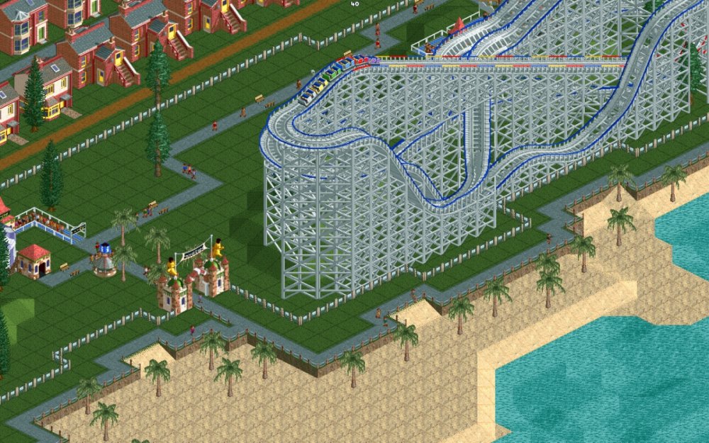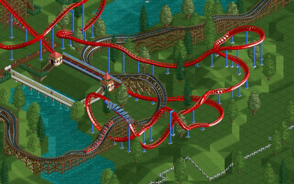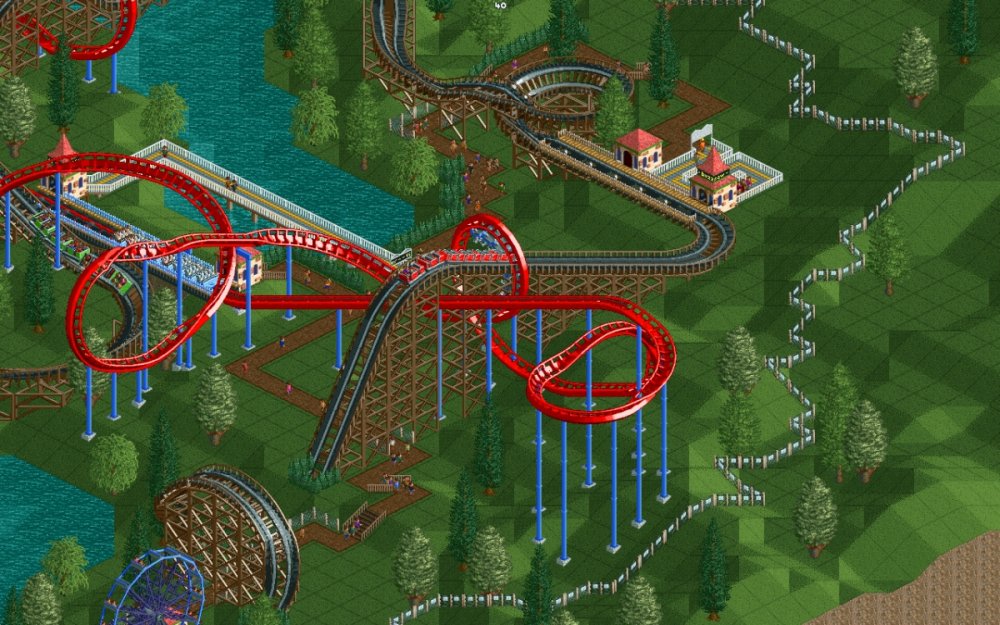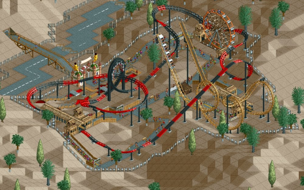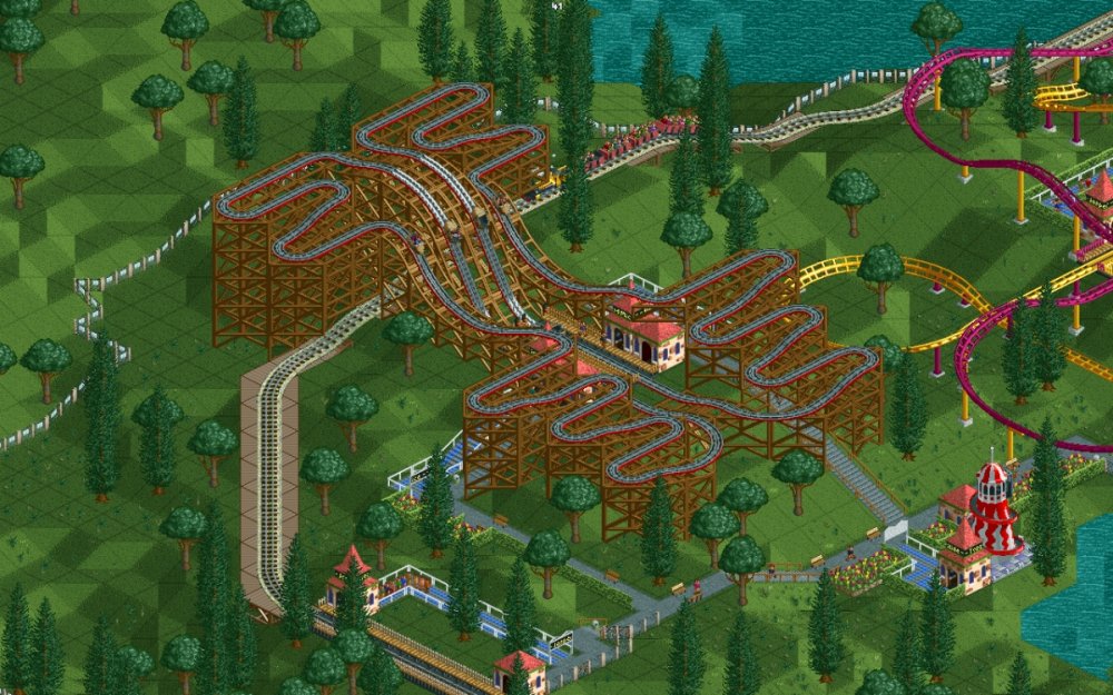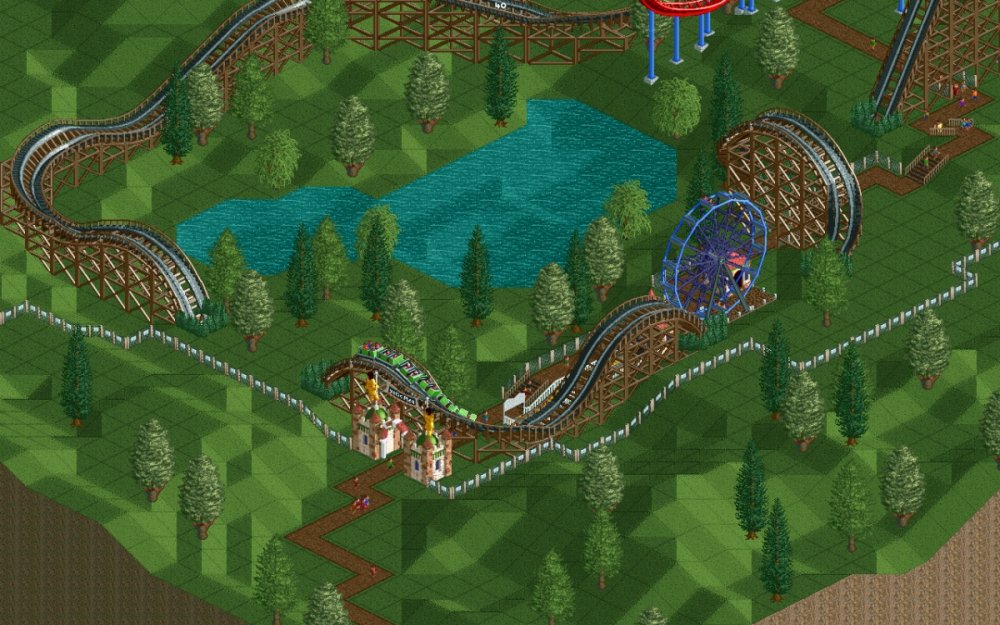 Hello everyone! This is my first thread along the lines of roller coaster games. Some may know me, and some may know that I've tried many times to finish a park like this, and it seemed to lose me inspiration. So, I've decided, this time, #11,00, to finish something and make people happy. Like Terry inferno's Brookwood Gardens, this will have narration and will be continuously edited week/by/week. **El Grande** - 1987 In the mid stage of this park's life, around 1985, plans for a new area arose. It was foretold to bring many new interesting rides and attractions. The park officials took a poll on opening day to see whether a general theme for this area would come to coherce. Opening day saw thousands of park daredevils and little coaster enthusiasts to the park. At the time, four roller coasters existed along with many attractions. Off of one of them, you could see the vast expanse This would arise four choices for the new area. Thousands would come from all over the world. At the end of the season, the poll votes were tallied up and the four choices and it was shown that option number 3 - a spanish themed area, would be the park's new themed area. Statistiques were received and 25% of the votes would go to each theme. Spanish with 24,798 would win by just over a hundred more than a rome themed area. In early 1986, vast amounts of rumors befell the park as a new roller coaster had begun to go up. Many speculated on what it would be, and a few were right. CCI, or Custom Coasters International, had contracted the park the plans for a large wooden coaster to go up in the corner. It was suggested that the coaster be above 3,500ft and 110ft tall to outdance the four coasters at the park. Soon in August of 1986, the coaster's layout had been decided and the work had begun. It wasn't very long before a name would come out of dust to name this behemoth wooden coaster. Another poll was taken among several names for the wooden coaster including "Nitro," Behemoth," "Titan," "El Grande," and "Suedo." It was quickly realized that El Grande would be the name. Opening day, on May 5th, 1987, El Grande would open to the public. A record amount of people showed up bringing the most on record from the park from 13,400, to 17,800. Sadly, the only pictures of the behemoth prior to El Grande's change of paint do not exist after the fire that burned down the park's picture chamber. **Butterfly** Along with El Grande, opening day saw one more attraction to the park. Something called a "Sunkin Heedge Gmbh" was added. While the overall reviews were good, the small attraction dubbed 'Butterfly' now has a very small reputation. _______________________________________________________________________________________________________ More to come soon!