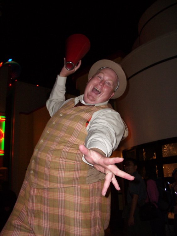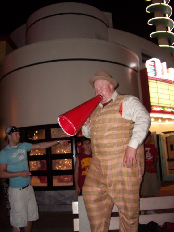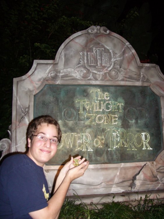 This weekend I decided to celebrate Hanukkah in the best way possible-go to the parks! Day 1: We started out at MGM Studios for some fun! At least this looked familiar... Not the entrance lobby covered in Hightower propaganda... Not the Hotel Hightower. I decided to take Geoffrey to see our version of Tower of Terror. Then he posed for a photo! He told me that he was working on a 3-D film, and that his first effect would have his hand coming at you just like this! This guy embarassed a man wearing a wife-beater. It was pretty funny... Truly awesome! We skipped this too! Here is the hidden Mickey of the night! Take that Wizards of Winter! Back for more Dancing Lights! The old studio is now an open air building! (But not for long!) Walls are now up around the former Who Wants to be a Millionaire studio. Midway Mania, here we come! I'm gunna pass on this one! For the beginning of Hanukkah, I decided to take my parents to MGM Studios so that they could see the Spectacle of Dancing Lights. We started out here...