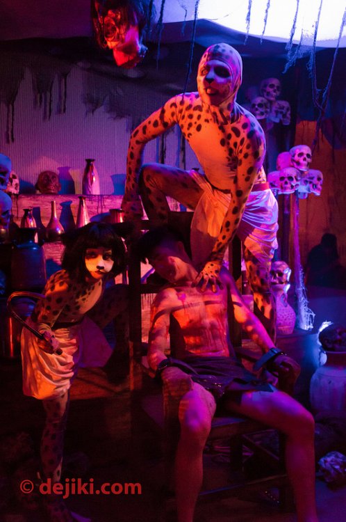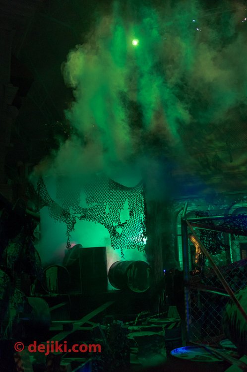 Halloween Horror Nights 2 review Special TPR edition; adapted from original post at http://dejiki.com/2012/10/uss-hhn2-review/ When night falls this October, Universal Studios Singapore will succumb to the harrowing forces of horror once again. Enveloped by the sinister powers of the Puppetmaster and his legion of evil, the park has transformed into several domains of fear where terror dominates and nightmares never end. Resorts World at Sentosa and Universal Studios Singapore has turned up the standards for Halloween Horror Nights 2, outperforming what they have achieved last year with more impressive efforts in theming, concept and scares. There are a LOT more scare actors this year and the entire park was open for guests to roam... or run. I had a fantastic experience attending Halloween Horror Nights 2 at USS with my sister and two fearless friends. Here is my review and trip report for one of the must-go events in Singapore. Before I forget: I would like to thank all scare actors for their amazing performances that created an incredible atmosphere and experience during Halloween Horror Nights 2. A BIG Thank you for those who posed for my photos! Review The entire park is open this year, with 10 attractions running and 3 new Haunted Houses to experience. The Dreamworks zone (Far Far Away and Madagascar) do not have any scare actors, theming or special effects. They provide a more direct path to The Insanitarium Haunted house. Scare zones this year are extremely elaborate and a great deal of effort went into the detail and execution. I felt that all of them surpassed the original scare zones in 2011, except for Total Lockdown. RWS advertised that there will be a "a frightful maze of five highly immersive scare zones" and three haunted houses, but there were only three scare zones: House of Dolls, Total Lockdown and Bizarre Bazaar. On the Event Guide, they are grouped together with Haunted Houses as 6 "Haunted Attractions". This is quite mystifying, because there is no theming or scare actors at Sci-Fi City and The Lost World. There is no explanation for the two missing scare zones, and on some marketing materials the term "five [...] scare zones" has been reduced to just "five zones", despite all 7 zones were open (and 6 of them had attractions running). The three haunted houses this year were incredible and the scare level definitely went up by a few notches. Death Alley is still short, with its very limited space to work with, but is quite a satisfying experience. I hope the park increases the number of haunted houses next year. As for the other two mazes, scroll down for a brief write-up on the walkthrough experience. The mazes this year use a lot of effects, including a fair bit of water as well, so be prepared. It's the park's second Halloween Horror Nights and it has not used characters, themes and elements from existing films and video-games. Instead, Universal Studios Singapore has developed its own characters and themes. The concept this year feels a little scattered compared to 2011. Having the Director and "The Final Cut" are very safe ideas, but placing guests as victims of multiple "horror films" (scare zones and haunted houses) works naturally with the concept of a Universal Studios theme park. I understand that the Puppetmaster is this year's icon (and supposedly "controlling" the other three characters), but it is hard to see any connection beyond his House of Dolls. After walking out of the first zone, the other houses and mazes appear to be exist independently. He does have a very short (and VERY easily missed) appearance in another scare zone. That is just nit-picking on my part, but the HHN events in the US were more well developed with a broad theme for each year (except of course, this year). One complaint this year is that the park sells a lot of flashy accessories (from lighted wands to swords) that guests could bring into the haunted houses. The lights from these toys were so bright that it ruins the effect of the Haunted Houses. Some of the park crew stationed inside would ask the guests to switch them off, but I observed that it was not strictly enforced. Crowd control could also been better. The House of Dolls was very difficult to walk through because of the amount of props and sets there. There was also some crowd flow issues with the Dungeon of Damnation, causing the walkthrough to slow to a halt at the very first room. The short event hours (4 hours) caused many guests to be very conscious (and upset) of the long waiting time. For the second week of HHN2, event hours are extended to 1AM. So now it's 8:00PM~1:00AM - five hours of fun! Crowd levels Opening Night was not a sold-out night, but the park was already very packed. Wait times for attractions go up to 90-120 minutes. It might be wise to get Halloween Horror Nights Express passes, but do note that they cost $40 this year. The reason the price doubled (from last year's $20) is because they could be used in all 10 attractions and 3 haunted houses. Be aware that while event ends at 12AM, the queues for attractions only close at 12AM (sharp!), hence you may still have some extra time to enjoy the park's attractions and haunted houses. Complaints on short event hours and long waiting time for attractions While the locals here are accustomed to queues (be it for new smartphones, concert tickets, hello kitty toys or FOOD), there has been countless complaints about the waiting times for HHN2 haunted houses. I have received feedback that HHN2 was very crowded and there was barely enough time to even visit all of Haunted Houses. I have also experienced it myself, waiting in line for more than 90 minutes for the Dungeon of Damnation. Many guests felt cheated that they could not experience all the attractions that were operating - although frankly, that's just... obtusely unrealistic. Some even said that they were only able to visit one Haunted House - and that's it for their night. I felt that the crowd and 