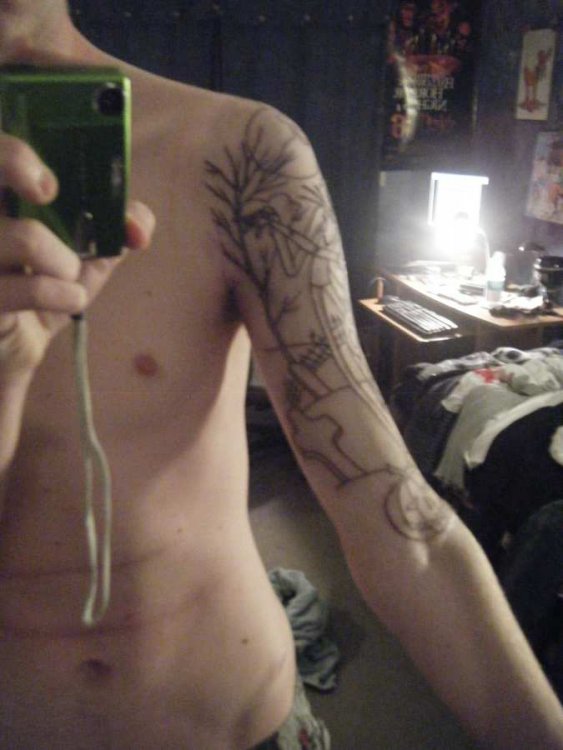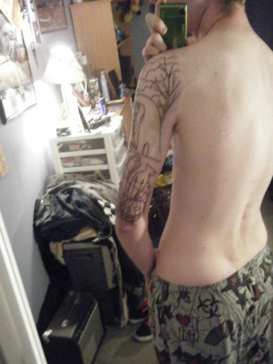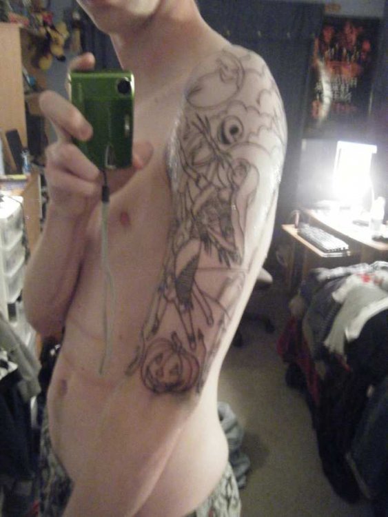 I have two so far, and one still needs probably 2 more sessions to complete it. 1. Pain level of your tattoo, 1 to 10, 10 being the worst pain possible. At the beginning I'd rate it a 5ish, but then you get used to it and it's not so bad, probably a 1-2. But anything close to bone is pretty rough. 2. How long did it take? To outline? To fill in? To completely heal? My ribbon took 45 minutes of needle work total, for outline and coloring. It took a week to heal. The outline for my Nightmare one took 2 full hours, and a little over a week to heal. The second session was about 1.5 hours, and it's still healing. 3. Is there anything to numb the area, before getting stabbed to death? I didn't use anything. The pain isn't that bad, it's mind over matter. 4. Are you happy with your results? Regrets? I love my Nightmare one so far. I'll probably get my ribbon touched up at some point. 5. Cost? Ribbon was $60...very cheap. You get the quality you pay for... My Nightmare tattoo is definately in the triple digits. Plus tips. 6. How do I know the right place to get it? I saw a good tattoo I liked and I asked her where she got it. And I had heard of that shop before from other people, so I figured it was a good one. Note I got both my tattoos at 2 different shops. 7. Did you have any excessive redness/infections/irritation? It's always going to be swollen and puffy and red right after. And I describe the day after being tattooed as just having a couple layers of skin grated off! A couple of tips I could share may seem straight forward, but be sure to eat food and drink water before. You should bring a bottle of water to the shop with you even, because I always get light headed right at the beginning and need a 3 minute break, drink some water, then I can sit for 2 hours. Also, don't forget to breathe! My first tattoo was a purple awareness ribbon, which represents Alzheimer's that my grandpa, and the pancreatic cancer which took my uncle. It's not a tattoo I got to show off. I got it for me, close to my heart, so I'll always remember them. And my second, which is still in progress, is for Nightmare Before Christmas which is one of my favorite movies and I thought it would make a very neat tattoo. P.S. - All those pics are right after I took the bandage off pretty much. The blood and extra ink did wash away. And here's sort of where it's at now, after the second session. Back view. Side view. After the first session, front view. Here's the first..kind of hard to tell, but it is purple.