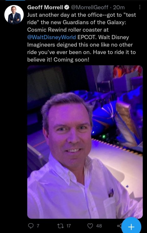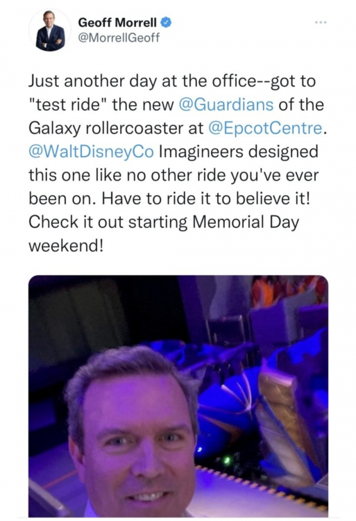 The tweet has since been deleted and reposted without the date, but the Chief Corporate Affairs Officer for Disney says Guardians of the Galaxy: Cosmic Rewind is opening Memorial Day weekend. -