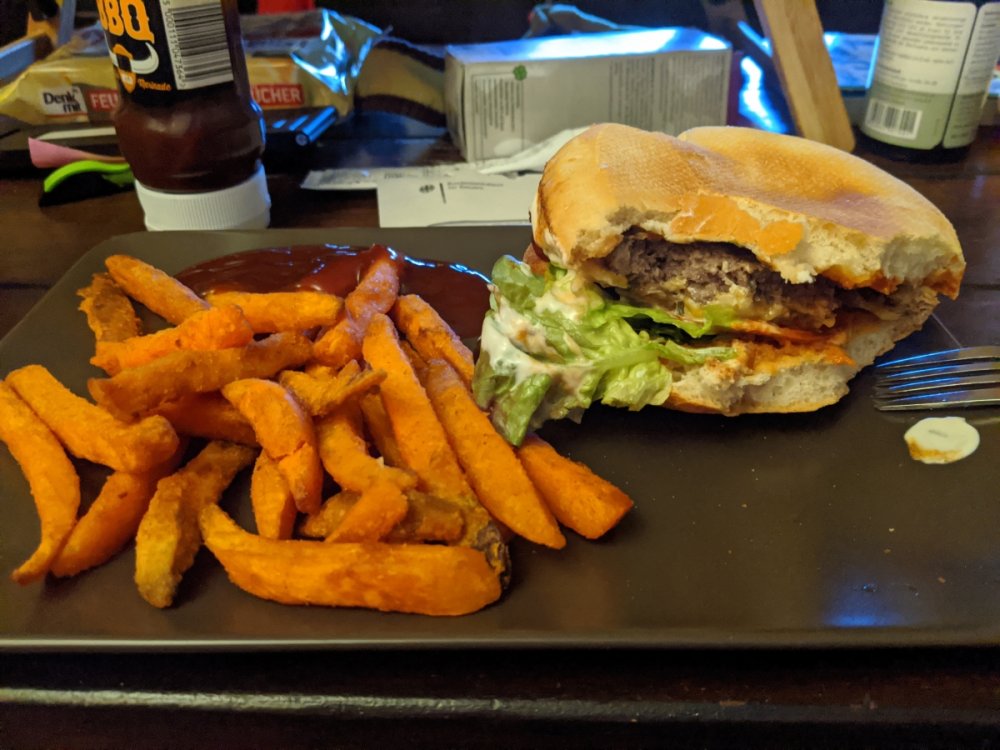 So.. We ordered burgers the other day to support our local food business. I had a triple cheese Burger with goat cheese, cheddar and gouda, roasted onions, bacon, sour cream, bbq sauce. Sarah had one with arugula, double cheddar, double bacon, fried egg, potato chips, onion jam, bbq sauce. It was so tasty. I beg them to survive the crisis. To complete them, we made sweet potato fries. Die Patin (The Godmother), Sarah's burger Drei-Käse-Hoch (literally Three-Cheese-High; meaning ankle-biter), my burger