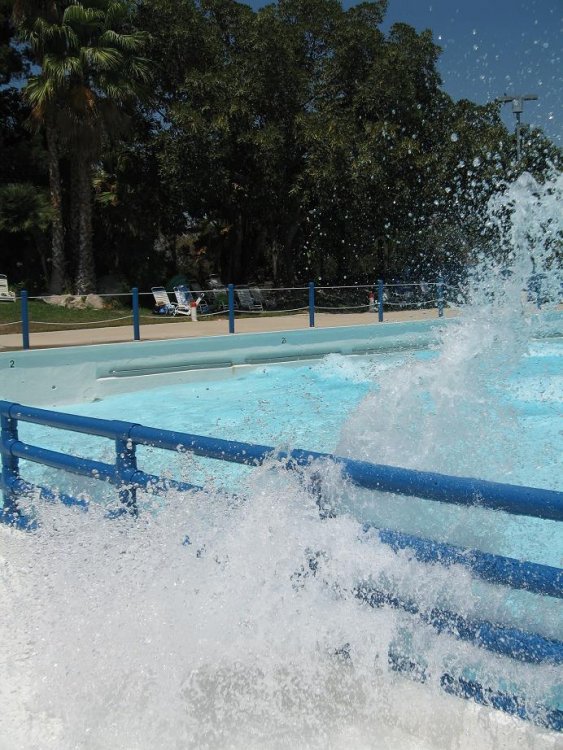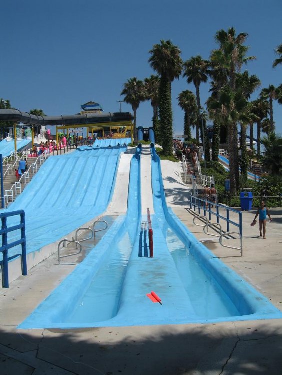 I'm introductionless. Awesome water park in Irvine. If you've seen a lot of Malcom In the Middle then you might recognize this place. Overall Wild Rivers looks like a small and crappy water park, but I left the place loving it! Highly recommended! While I was walking around taking pictures my friend Kevin (XII) was getting video. Patriot twisting and turning over the parking lot. The only thing special about Patriot is the rollback. Two very painful slides! The trasition into the bowl sucks! Cou can feel where the different parts of the slide connect (the feeling of the sections of the slide slicing up your back). Still fun though. In line for Patriot you can watch riders smack their head against the bowl as they enter it. This was bumpy as hell! It's fast, the rafts twist around, people fly off or get stuck, and the awesome pops of airtime that causes it. The Wipe Out slides were interesting. At the start they have you sit in front of a huge water tank. When it's time to go, the op releases the tank of water and it flushes you down the layout of the slide at a really fast pace. It's kind of a water launch. Sweitzer Falls are the slides next to Bombay Blasters. The slides that don't go underground. It is a bumpy slide because of the rubber tube, but you shoot out the slide FAST!! You start half way up the hill and the water slide immediately dive and travel underground. The whole slide feels like a launch. (now can you get an idea where it starts?) My favorite water slides in California!! (think where the hell the slide start from) Surf Hill: you can get stuck half way down, or go full speed and loose the mat on the way down. Every slide that is blue is made out of rubber! These things are pretty much giant slip n slides. The rubber slides are really bumpy. Not in a painful way though. Just kinda whiplashy. The Liquidator is one of those dangerous rides that are always closed and the park doesn't remove them. You would probably die if you went down it. At least thats what one of the staff told me. WAHTUBEE! The water slide has a really cool name. The longest water slide in the park. The first part of the slide is ok but then there is sets of heavy trims. Wave Pool area The Splash Zone is attacking! When the sign said "Splash Zone" it wasn't joking! You get a board to use in the other wave pool. This park has a lot of familiar names for slides like Hurricane Harbor, Typhoon Lagoon, and Congo River Rapids. Wild Rivers has the type of wave pool where they have people wait in line to get in it. All the good slides are in one big area. This place isn't that big but the slides are excellent! This place kind of reminds me of Blizzard Beach. There is a small slides area on one side of the park and a hill of all the intense slides. Park entrance