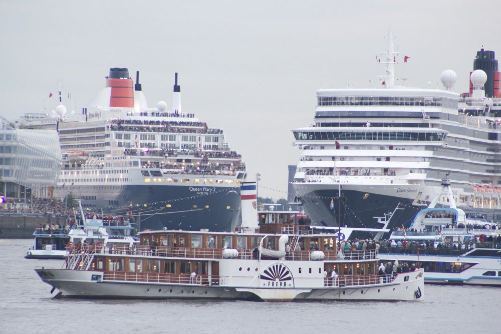 15. Tonight was "Cunard Day" in Hamburg, where the gigantic Queen Elisabeth ship "met" the even gigantic-er Queen Mary 2. I managed to get a pretty good seat for the action, but there were literally thousands packed down in the harbor trying to see everything. Here's a nice pic and a video will be uploaded by the morning It's rare for two huge ships like this to be here at the same time.