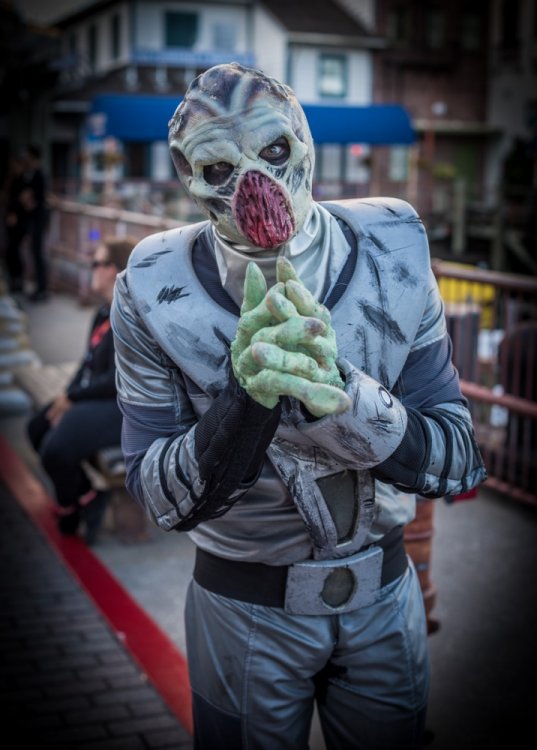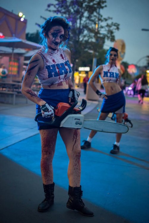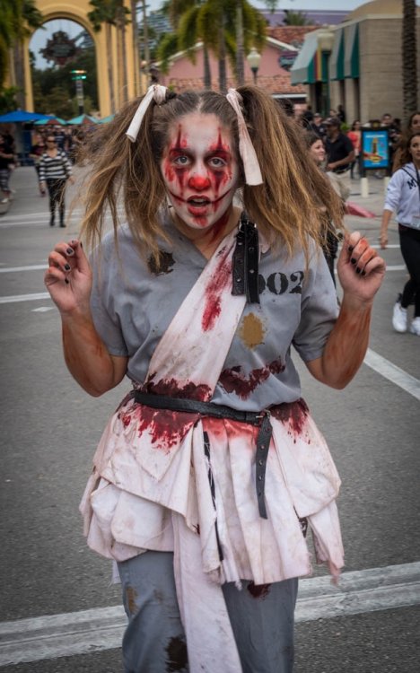 When I grew up in Germany there was no such thing as Halloween. The only occasion on which we dressed up was Carnival. Because of Gulf War I that custom was cancelled in 1991 leaving the german costume makers with a massive overstock. In order to solve this problem, the industry started a marketing campaign to introduce Halloween in Germany. 1991 was also the premiere year of Universal’s Halloween Horror Nights, although the event was called “Fright Nights” then, took place on just three nights in October and featured only one haunted house. For a German visitor, it’s astonishing how “easy” Americans are when it comes to “blood and gore” (as astonishing as it might be for an American visitor how easy we are concerning nudity). Movies like “The Evil Dead” have been forbidden in Germany until 2016. “Forbidden” means: you may not advertise them, sell them, show them (to anyone) and they will be confiscated if you own them. Everybody has seen the movie on VHS though. The same applies to video games: ”Doom” was banned until 2011, Gears of War until 2016. Strange fact: those games were not banned in other European countries so you could easily (and legally) buy them via mail order. Thank you European Union! That said, I must say that the Universal Halloween Horror Nights are massive. It’s amazing that the HHN Team builds nine haunted houses from scratch every year. The amount of detail they put into those temporary attractions is just mind-blowing, especially when you consider that you basically rush through them while hundreds of foul creatures are trying to scare the living daylights out of you. Oh yes, those scare actors: amazing costumes, great make-up, and a mean attitude. And then, there are the “scare zones”: I sort of like those open air places better than the houses because they give you more opportunities to watch and interact (which means: a zombie creeping up from behind while you are distracted). And they have great shows! Some of them – like Bill & Ted – might be a little bit more enjoyable for Americans, because as a German I get about 50% of the jokes at best. Universal is doing a really great job on Halloween Horror Nights and the event is growing bigger and bigger and bigger each year. And: more crowded. Even on a slow day lines for popular houses reach up to 3 hours pretty early. So an express pass is a clever investment. But even if you can eliminate the waiting, there is still a lot of walking involved as most of the houses are outside the park, inside the sound stages or in tents in the back of Men in Black. If you’ve been in the parks for the day, this will result in aching feet. I speak from experience. From a personal point of view, I have to admit: I’m a pussy. When I’m home alone at night, I turn on the lights in the house. It’s super-easy to scare me. So while I really enjoy visiting the event with my friends, I feel they enjoy visiting it with me even more. But it’s better to fear the zombie around the corner than the tax assessment in the mail, right? Nightmare made by H.R. Giger French maid ... rotten Disney sure puts pumpkins to other use while Halloween Haystack monster Sometimes they use literature themes for their houses - like this Edgar Allan Poe nightmare Now that is a blunt abdominal trauma Freezing cold - thanks to air condition Closing your eyes won't help either She's going to get you Now that's a show a fully understand! It's Resident Evil - not the Milla Jovovich movie but the video game An american Werewolf in London in Florida in a haunted house Zombies. Works all the time. Lunatic ladies One very beautifully designed scare zone Armageddon - chicks - gas masks, feels like home Zombie cheerleaders with chainsaws. It doesn't get any better than that! Wait. It does! Ninja geishas with chainsaws. Take you chance! And one of her sidekicks Guten Appetit, die Dame Light and darkness ... The director will see you now Hollywood, 1939. Amid the glitz and the glitter of a bustling, young movie town at the height of its golden age, The Hollywood Tower Hotel ... wait ... wrong park Headache? Light and darkness and pumpkin monsters Bad Alice Bad bunny Goodbye for now -