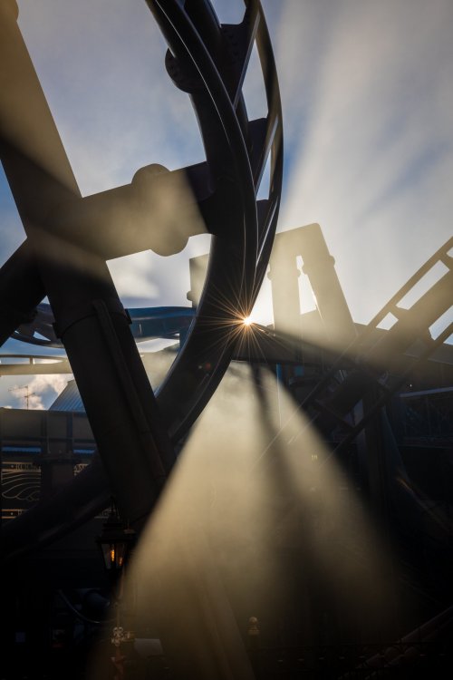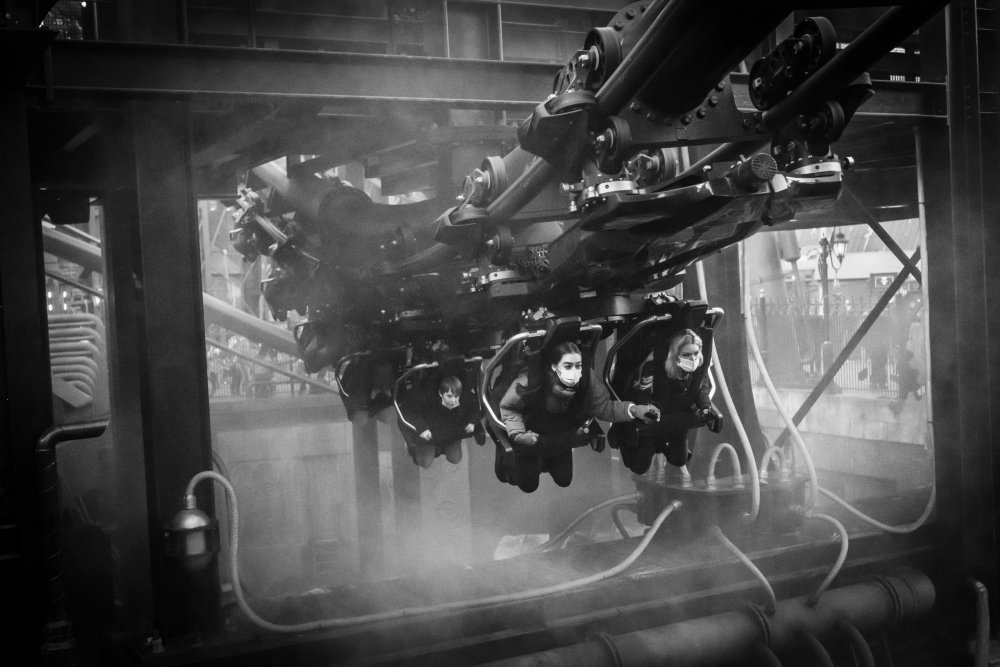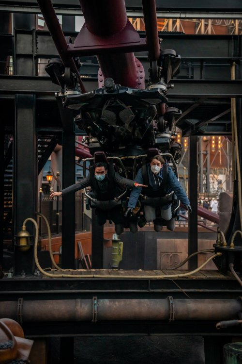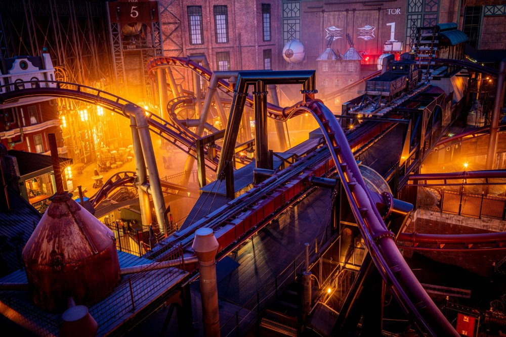 As some regular Theme Park Review readers might know, I live in Bonn, which is not only the former capital of Germany, but also very close to Phantasialand. The park has a solid reputation for building excellently themed roller coasters like the “Colorado Adventure” Vekoma mine train, the B&M inverter “Black Mamba” and most recently the Intamin multi launch coaster “Taron”, embedded in the genuine world of “Klugheim” that opened in 2016. Phantasialand is a family owned park, so it came quite as a surprise that they announced another world class rollercoaster to open in 2020: F.L.Y., located in the new themed area “Rookburgh” – a steam punk type of land. This flying coaster, build by Dutch manufacturer “Vekoma” features 0.75 miles of track, two LSM launches, a “dark ride” part, two inversions and the most innovative loading system I have ever seen on the flying coaster: to enable riders to board, the track is mounted against the station wall and the seats are rotated 90°. To put passengers into the “flying” position, the seats rotate back seamlessly after the ride has passed the short “dark ride” section. The whole setting of the attraction is amazing: steam emerges from the underground, there are tons of details and the sound design creates a perfect immersion. But it is at night, when “Rookburgh” really shines. A visit during the “Wintertraum” event is greatly recommended, as the park stays open late and there are little to no wait times – even at top attractions like F.L.Y., Taron and Black Mamba. The steam effects and the low winter sun make for some cool "god rays" The coaster interacts with the elaborate themeing. I really love that shot. Speaking of themeing … They use metal detectors and a clever locker system, so F.L.Y. flies literally over the guests heads. Tracks and trains and winter sun and blimps and Vekoma goodness This inversion makes the cars look like a petal. Pier 5 Just one of many "airtime" moments. And yes: that's ice on the top of the backbone. 30°F. A panoramic view of F.L.Y. and the whole "Rookburgh" area. Pretty, uh? To the left you can see the first straight LSM launch segment. For the real enthusiast, there is a capsule style hotel embedded into "Rookburgh": "Charles Lindbergh" gives guests some exclusive views of "F.L.Y." (as the trains literally travel around your rooms) and front of line access. I did mention the excellent themeing, didn't I? It's all about flight. They might not completely follow german mask policies, but at least those girls seem to have fun. They do way better (as most of the guest do) One of the infamous steam effects. This gauges turn red before those effects go off. Did I mention the themeing? I'm pretty sure, I did. And there is lot of it. When the sun sets the whole area becomes even more "magical". After sunset. That's some impressive view, isn't it? They even do a short "light show" when the lighting turns from "day mode" to "night mode". Another panoramic view of "Rookburgh". Track and lights and steam. This is the second launch stretch. It catapults you upward.