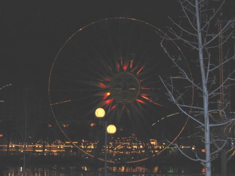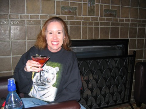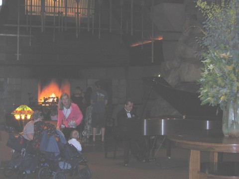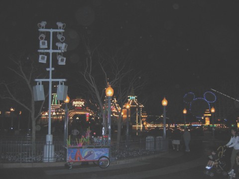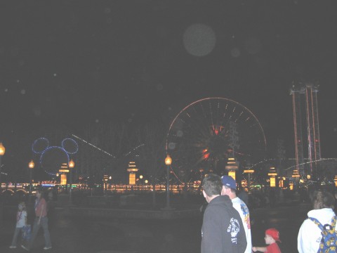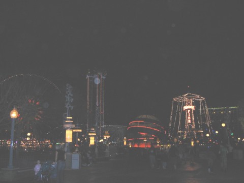 pics continued Meanwhile, back at the lodge, it is time for a cosmo and call it a night. Didn't ride the ferris wheel, but it looked like a fun ride. What pier picture would be complete with Mickey Mouse! Yep, another shot More of the pier Hey, the pier at night. This might be a better shot. We thought this was cool. It is the Grizzly with the moon in the background. I don't know how you can ride this thing at night in the cold. We went back to the hotel to change for the night and the piano player was playing in front of the fire. and another.. Here comes more of it.. yep, it's a parade alright. YAY! The parade is starting. -