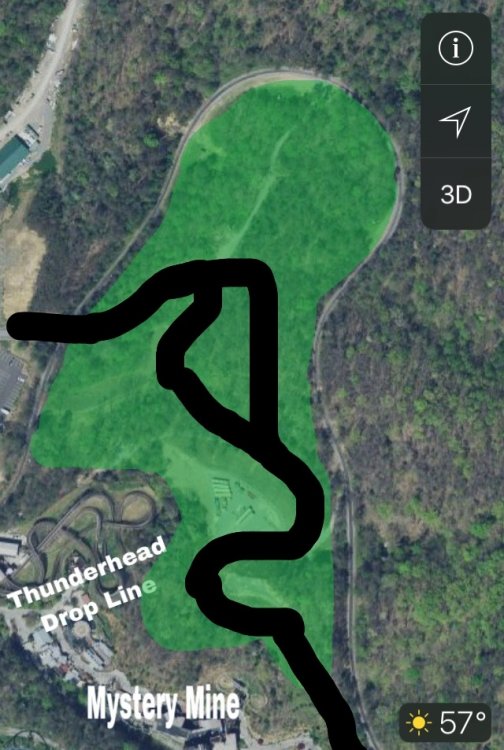 Just in case anyone is still confused, I made another updated map. I marked where mystery mine, thunderhead, and drop line is. Green: Cleared Land/no trees——— Black: Existing Maintainence Road/New Path -