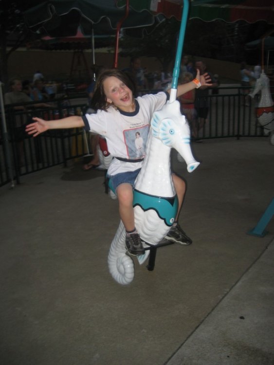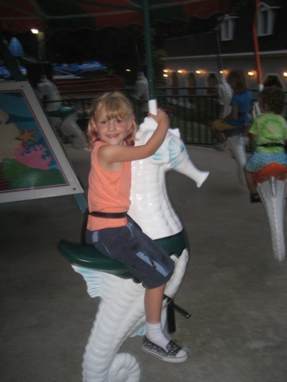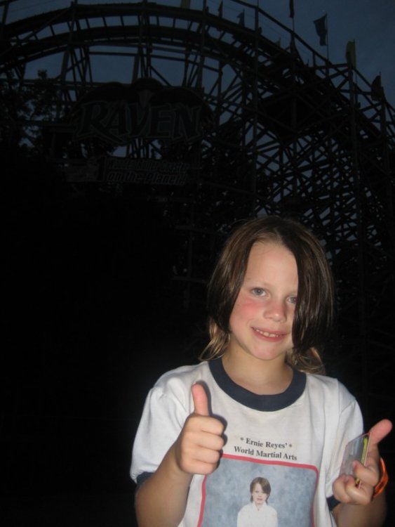 So I figured I'd finish this TR while watching the Olympics. We finished off the night with a couple of kiddie rides in Christmas Land and then one more night ride on the Raven. Thank you Holiday World for making our first vist a memorable one. We look forward to the new "tall" addition, and getting back to you very soon. Kiddie bumper boats. The ride op had to wade through the pool to get the kids back to the loading area. It was quite comical. I leave you with this. Raven at night. 2 enthusiastic thumbs up! THANK YOU hOLIDAY WORLD FOR A GREAT DAY! One proud (uber intellegent, smokin' hot) mamma! Look Ma! No hands! Yes, that's right... ...the magic flying seahorse ride! -