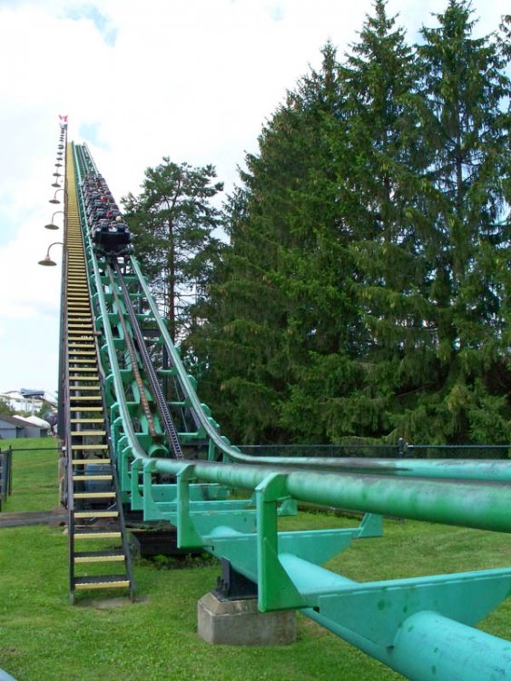 Day 4: Kennywood - Sometimes authentic-retro comes across as janky instead of charming. Yeah, I'm a purist, but I'm honest, too. - Phantom's Revenge was fun, but I was kind of let down by "the big drop." Still, it has the best bunny-hill airtime of any Morgan, or any Morgan/Arrow hybrid, for that matter. - Thunderbolt was running terribly. It felt Vekoma-ish. - Jack Rabbit was OK. I felt the double-down on Phantom was better. - The Racer was very fun. +1 for Mobius-ness. - Exterminator was insane. If Six Flags had gone with that model instead of the regular Mack mouse, you probably wouldn't hear many complaints. I'm pretty sure my face hit the side of the car at some point. That's bad ass. - The fried Oreos were like warm chocolate chip cookies wrapped in a beignet. Don't know what a beignet is? You haven't lived yet. Day 5: Hersheypark and TPR I just visited Hersheypark back in early June, so I don't have too much to add. ERT on Fahrenheit and Storm Runner was excellent. Fahrenheit actually went up a little in my rankings, and Storm Runner went down a little. Matt (Spideyfreak) and I credit whored on Wild Mouse and Roller Soaker, and it's always nice to have a partner when whoring. And I want to say hey to all the great people I met on Friday: Matt, Dave, Eli, & Kerry, Mike Austin (a.k.a. Wank), Dominic (SixFlagsBoy), and Joe from GCI. It was great to meet such a cool group of people, and I hope our paths cross again sometime. MOAR PIKSHURS! Joe and I give this trip report four awkward thumbs up. Thanks for reading, everyone! The view from TPR Trivia. With 100% less Chinese finger cuffs. Would you like some butter with that cobra roll? Perhaps some sorghum? The Comet is so cool it doesn't even need a witty caption. It just says "Yeah... uh huh" like Diddy in a Biggie song. Does it count as a foot chopper if you're going 2 mph? Grab some tissues, you Norwegian Loop fans. Oooh... hot panoramic action. Matt and I give Roller Soaker the thumbs-down. They could have simply made us stand in place for 30 minutes, then dump a cold bucket of water on us, and it would have accomplished the same. ??? Morning ERT on Storm Runner. Wait... what the hell kind of face is Robb making? RAC, now with less ER. I know it's a classic, but it kicked my ass in a bad way. These people are happy because: a) they won't be enduring four horrific Arrow inversions. That's it. There are no other choices. The correct answer is a). Morgan-ized! I snapped this picture on the way to Pittsburgh. New motto for this site: "Duck, TPR!" -