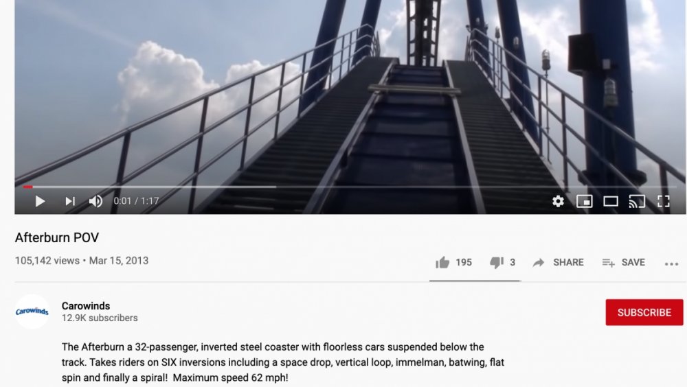 also carowinds lists afterburn as having a "space drop". the only thing i could imagine this applying to is the first drop, which is just a regular drop. guess it just sounds cool in advertising, along with a "flatspin", which i guess is their version of a "wing over" aka a cooler way to say corkscrew.