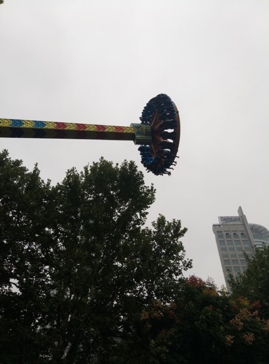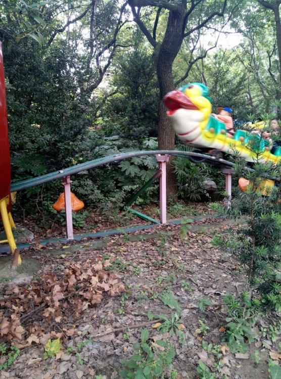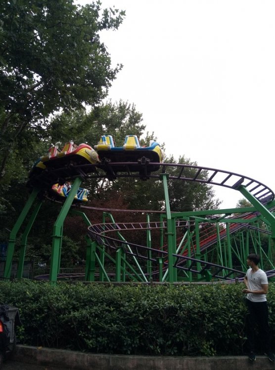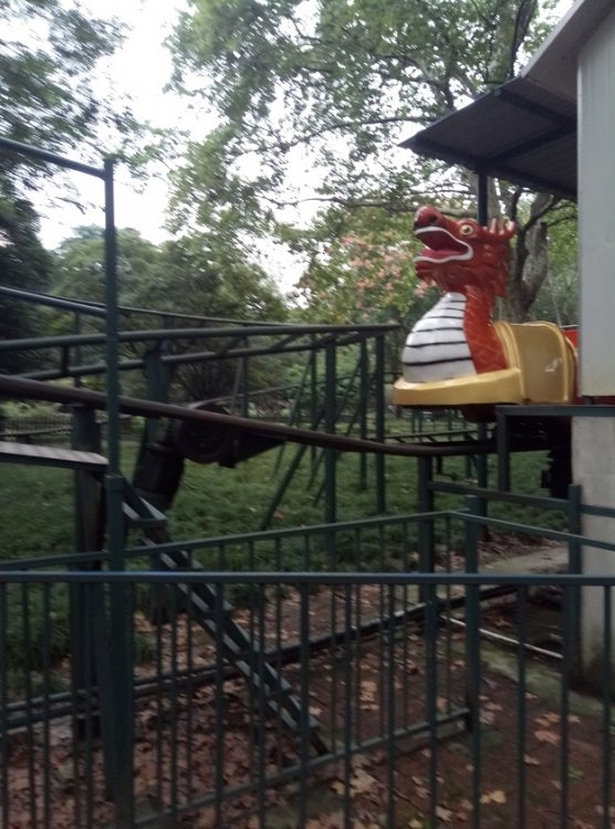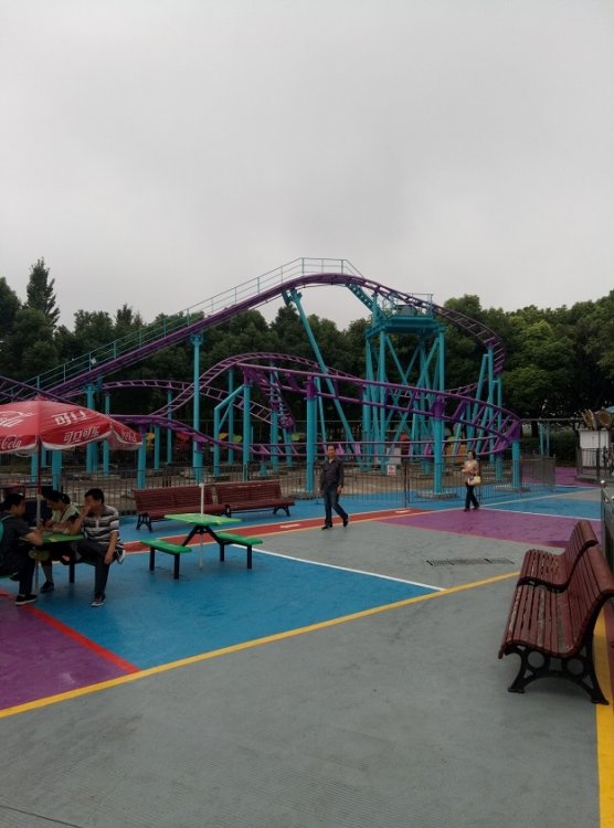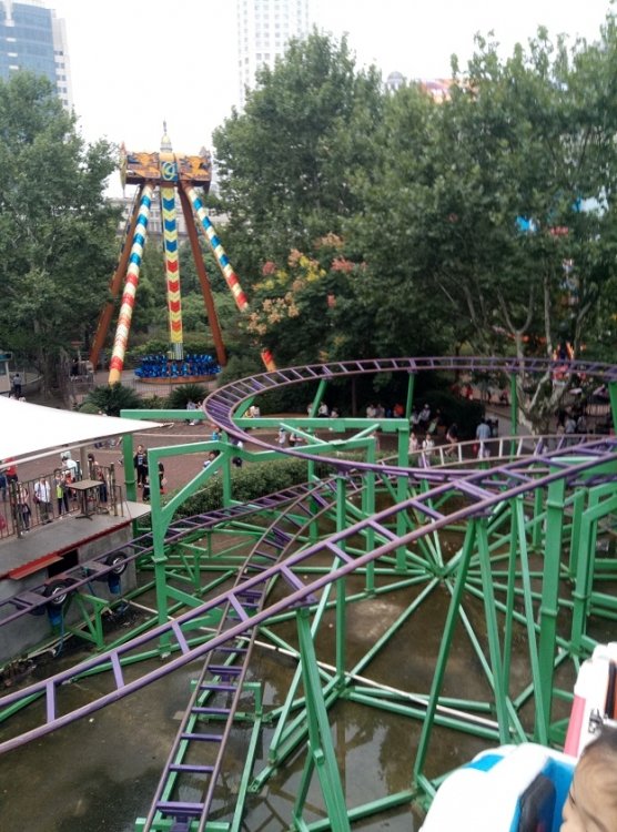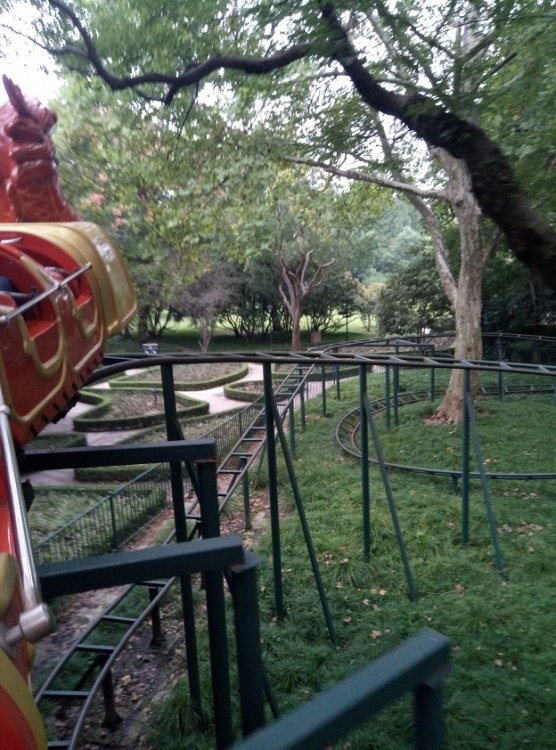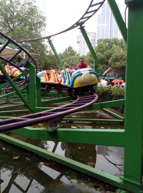 October 2, 2017: Shanghai-Day 1 Century Park/Peoples Park/Zhongshan Park I visited three parks today. I visited them all in 2011, but all of them replaced their coasters with new coasters. This meant I had to go back again. Can you think of a better reason? First up today was Century Park. It has its own metro station. There are several family rides here, including a Golden Horse family coaster. It is a step above the Golden Horse Space Car rides. It is very comparable a Vekoma Roller Skater. It became coaster #1094 for me to ride. A short subway ride later brought me to Peoples Park. This park has a small collection of rides. They recently added a Chinese made copy of a Zamperla family coaster. I enjoyed this ride (#1095), but notice that the train seemed to have a problem going over the lift. I bet the Zamperla originals do not have this problem. My last park of the day was Zhongshan Park. It is one of many Zhongshan Parks in China with rides. The old Wacky Worm type coaster has been replaced with a twin helix dragon coaster that is not a powered coaster. It runs on gravity. It is a bit choppy. It became coaster #1096 for me to ride. There was a light mist when I visted each park, but they kept the rides open. This is great. It is also only day #1 of my 2017 Shanghai trip. Stay tuned... This is Century Park. It is my first park of the trip. These trees are probably very nice in the summer when temperatures soar. The lake is very nice at Century Park. A Golden Horse family coaster is here. I love the colors of this one. A short subway ride brought me to Peoples Park where I would ride this. It is a knockoff of a Zamperla ride. It is a fun little ride, but there seems to be a major design flaw in the chainlift. It sounds like the train is being ripped loose from the chain as the train goes over the top of the lift. A lot of people at Peoples Park were enjoying this ride. My last park of the day would be Zhongshan Park. This is one of the few rides here. A twin helix GRAVITY powered dragon coaster replaced the old wacky worm type ride that used to be here. Here is an onride shot to finish my first day of coastering in Shanghai.