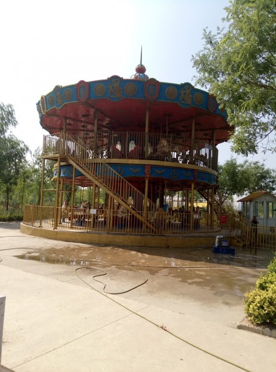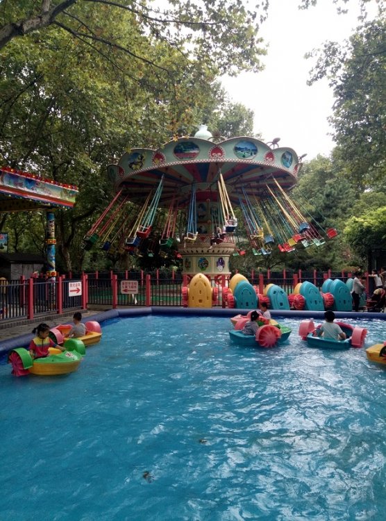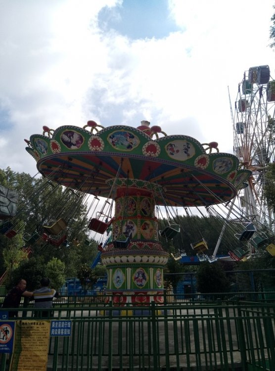 July 23, 2017: Qinling Happy World, Xian, Shaanxi, China This park is located south of Xian's city center. It is next to, but not part of the Qinling Wildlife Park. This park is a 10 minute walk past the ticket booths for the wildlife park. There are three coasters. Four Ring Roller Coaster is a double loop and corkscrew that is getting a new train. it was not open today. CHINA! Hanging Roller Coaster is a Golden Horse suspended mouse coaster. This is the second one of these I have experienced. It is a fun ride for what it is. Nothing too thrilling, but I like suspended coasters. A Golden Horse Space Car coaster is here too. This park is very small, but the placement of the rides allows it to offer many rides for guests. I think it is a nice park. I just wish that the big coaster had been open. It seems that coasters are either closed for maintenance or they do not want westerners to ride them. If CHINA! keeps this trend up, I may have to take my money to coast elsewhere. I have now visited 551 parks and ridden 1083 coasters. This will be the last park in my Xian adventure. I return home tomorrow. Let's start with the carousel. Nothing new here.... They have a breakdance type ride and beyond that, a Golden Horse suspended coaster. I do not see these too often. This is only my second one. It is a fun little ride due to it being a wild mouse that hangs from the track. The flume here has a layout that can be found in many parks in China. This is the biggest coaster in the park. It is an extended loopscrew. The train is being replaced on it. This means it was not in service today. I wish I could have ridden it. This will finish the TR.