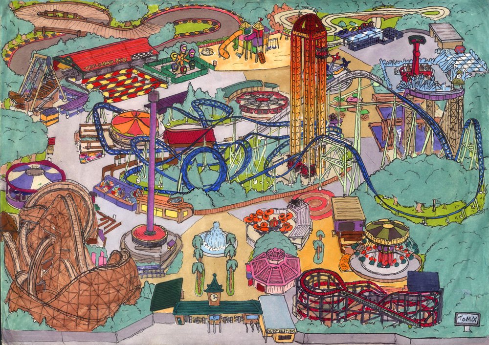 Oh my god. I finished it. I finally finished it. I haven't finished a park map drawing since I was in middle school! Full size picture can be seen here: http://www.deviantart.com/download/301951702/amusement_park_map_by_neotomi-d4zrvfa.jpg My DA page: http://neotomi.deviantart.com My park map -