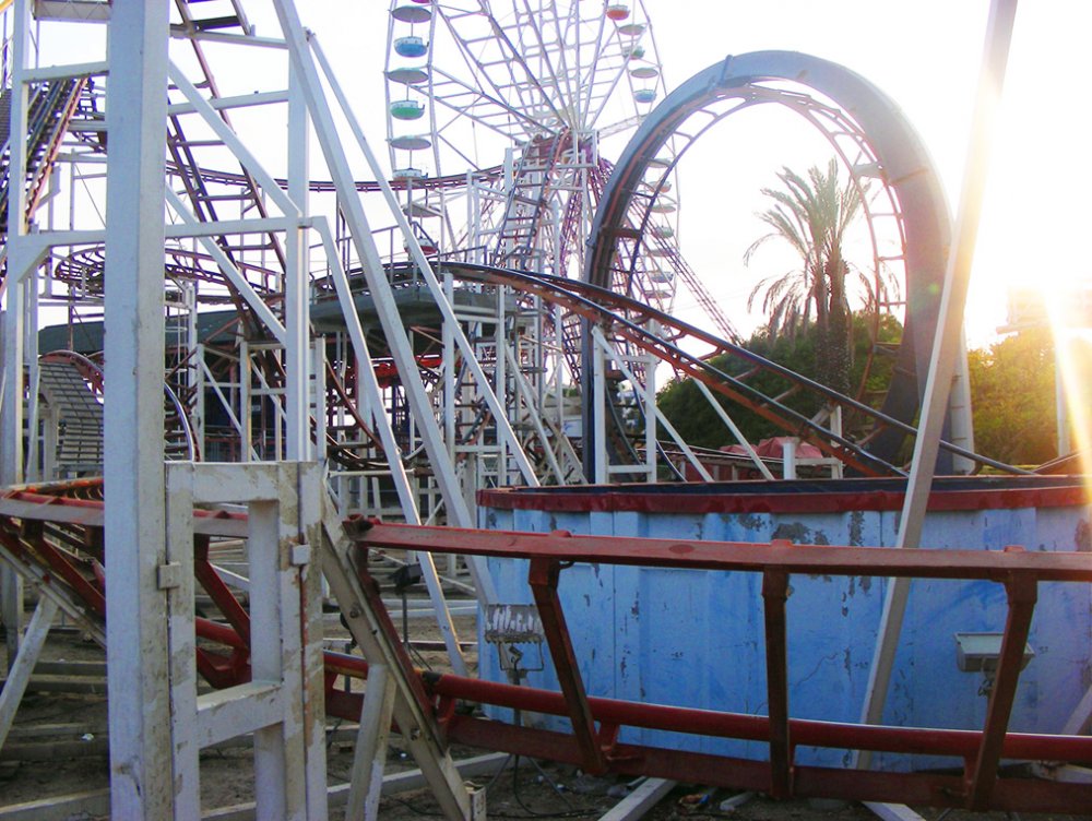 Part two I just like this shot because of the Skycoaster in the background with the people waiting for the ride to go. Part 3 later. this is one of the rides that always has cool music playing while it works. I heard a song I like for the first time on this ride. For those of you who don't know how this sort of ride works: It's a long gondola connected to two arms, much like a top spin, only you sit facing sideways, and both arms swing independantly. Unlike the flipping version of the ride, here the gondola swings freely. It's alot of fun. It is a very fun ride. I used to LOVE it when I was younger, but I've ridden it so many times since that it's just "cool" for me now. The people on the ride were very friendly to my camera! The park also has this ride: It's called the Grand Canyon. An interesting thing about this ride is that there's actually ANOTHER ride that goes between this ride and it's own backdrop! The minature railway passes there. A Gaggle of Geese at the loading dock The Swan Boats fromt he other side of the waterfall. The waterfall, and the fact that the park's path goes under the rock it falls from is more of why I think the park has great landscaping. If you scroll up to the first Ferris wheel pics you can see the area from afar. The Swan Boats roam the lake that's in the middle of the old half of the park. They look very fun but you have to ride with a kid, if I'm not mistaken, and the line was huge, so I didn't get to ride them in eons. I might of been willing to kidnap a kid for some illusive kiddie credits but an overcrowded swan boat ride is just a bit over the line for me. Next up we rode the bumper cars. They were a bit slow and they don't crash that hard but it's hard NOT to have fun in a bumper cars ride. This giant lake just appeared one winter next to the park about ten years ago. Not kidding. One of my favourite rides in the park from a weird angle. More on that later. Rishon Letzion and the dunes from the ferris wheel. Behind the rocket ride you can see where the ride graveyard is now. You can also see a large fenced off area next to the park. A friend of mine that lives in Rishon Letzion says he knows for a fact that theyre building a road there, but since that doesn't looks like a logical place or shape for a road's construction site, I can keep wishing it's a huge addition to the park. However I noticed that there isn't a gate between the park and the area, though there are gates right next to each toher. I love that Loop 2000 is right by the Ferris Wheel. Makes for some pretty awesome views. Oh, and I forgot to mention, on my way to the park I saw the most interesting view... An enormous, crowded cemetary, and in the distance, the silouhette of the skycoaster and ferris wheel. I wish I would've gotten a picture of it. It was very symbolic of many things. Life in Israel would be one of which. If you put together the sandy area and the grassy area there's enough space for a proper rollercoaster! Oh I wish! I would LOVE to have a proper rollercoaster in Israel! I mean, sure, our SLC and pinafari are good, but theyre still an SLC and a Pinafari. Would be nice to not have to buy a $1000 plane ticket every time I want to ride something ebtter than an SLC. Seee the sandy patch to the left of the blue and yellow dome? I THINK that that part used to be seperated form the rest of the park by a fence, and that was the park's "junkyard". But now there's nothing there, if I remember correctly. I hope this means there's a new ride planned! It's too bad. It looks like alot of fun. I don't know why it closed. It has banked turns. But even if it did have to close, it's a shame that they don't put up anything in it's place. It's a very large attraction. The figure Eight Go-Karts. They have been closed for years. I wanted to ride them ever since I was little but they closed before I was old enough to ride them. I think you had to be like 16 to ride them but I'm not sure.