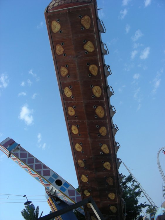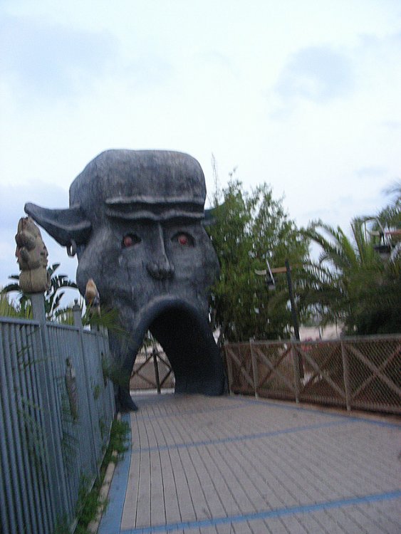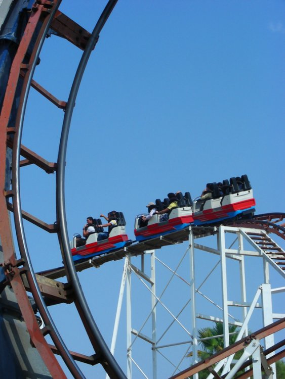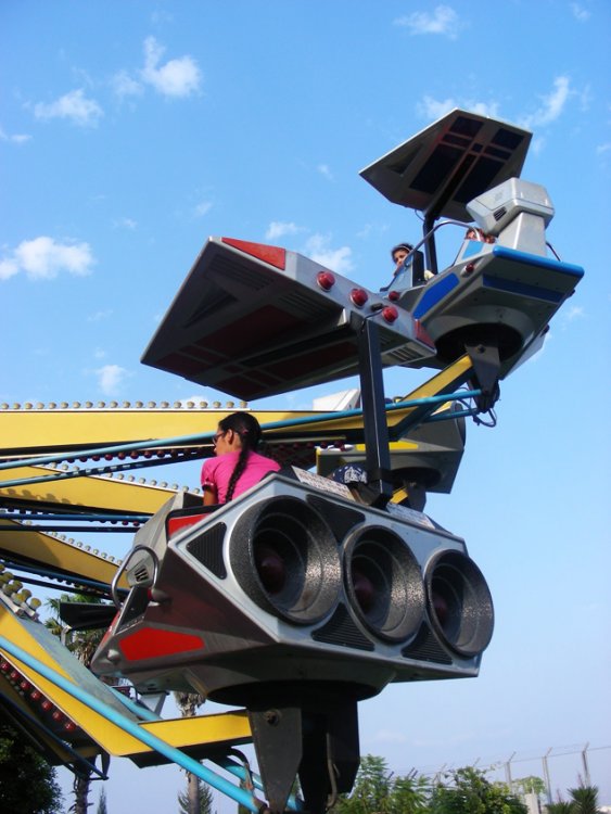 Part 3 Some ethnic music started playing so the kids in th eboat started clapping their hands and the one at the front just stood up and started dancing. The ride op immediatly blared across the speakers for him to sit down. Part 4 coming up soon I claimed this pic looked a bit like "Nymphs on a log flume". Elad just raised an eyebrow at me and said "Riiiiiiight..." That's odd. I don't think I ever noticed that Tiki hut in the middle of the ride before! I wonder if that's another addition to the park? Or maybe I was so busy belitteling this park that this is another one of the cool things I missed The first lift After they got off the ride they hunted us down and asked for Elad's ICQ number so we can send them their pictures. Personally I was surprised that they didn't ask us to delete them on the spot. Workin' it for the camera While taking pics for the ride these two girls started posing and climbing all over each other for the camera. Which... Surprisingly enough, hardly gets you wet at all. and down the big, not so steep hill. Then the boat turns and climbs up the tall lift hill... (Note the arab woman in full body covers in the front row) The ride has two drops. The first one, show here is small, but steep. It gets you absolutely and completely SOAKED. Always fun to rock the log boat. And end up at Terror Falls: The Park's log flume. From my experience it is one of the better log flumes out there. Not layout-wise, but it's smoother than ones I've ridden in america, seeing how in america the boats constantly bump up against the side of the track, and in Terror Falls they hardly even touch it. As we continue our clockwise trip around the park we pass under the artificial waterfall rock When I was little, Loop 2000 and the Pinafari Zyklon at another amsuement park were the only coasters in Israel. Riders must be 12 years old to ride Loop 2000, and 8 year old to ride the other one(Well, younger if accompanied by an audlt but I didnt learn that untill I was 8). So many many times I stood by that face and gazed up at the loop, waiting untill I was finally old enough to ride it. But when I was 9 I went on the trip to america and so my first looping rollercoaster was Revolution at SFMM. Which is funny if you consider it is much bigger, and yet I had to wiat untill my 12th birthday before I could ride Loop 2000. It is placed right next to Loop 2000, so we went and rode it again. This is the newest ride. I never heard anything about it being added. It is the kiddie bumper cars. I was surprised to see it there becuase I was SURE that the regular bumper cars stood there before. And yet it doesn't seem like the bumper cars have even moved. The addition of a kiddie ride is another reason why I suspect the park is about to expand. I hope I am right. I also found it funny that the kiddie bumper cars actually go faster and crash harder than the adult version! It is surprisingly scary to turn the car so much that it travels sideways or backwards. In the front of the taller gondola you can see the screen on which you play the game. This is the rocket ride. I have never heard of or seen another one like it anywhere in the world. Basically it's your baisc "Gondola can go up and down" carousel, but here the gondolas can also turn. But wait, there's more. The movement of the cars is controlled by an 80's arcade game shown in a screen at the front of the car! You play the "Space invaders" type game using a joystick, and the way you move the joystick also moves the car! Probably one of the earliest interactive electronic rides out there.