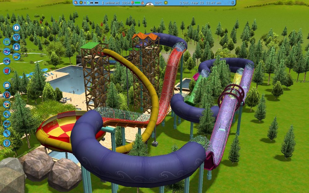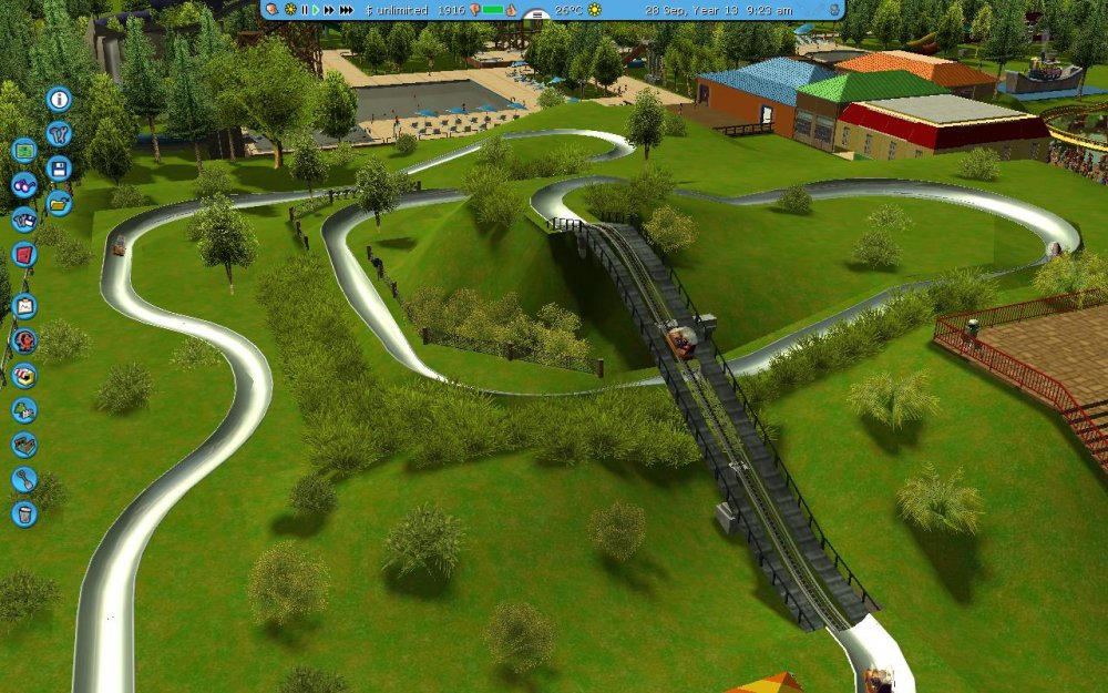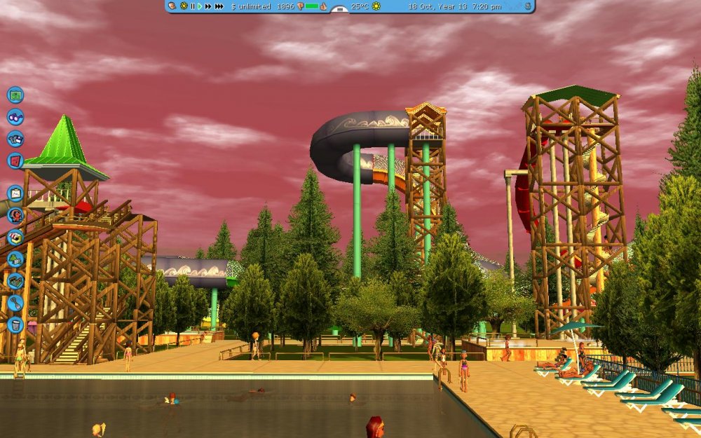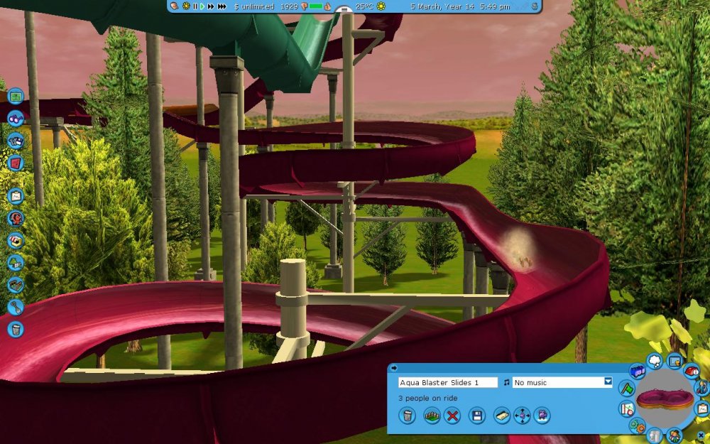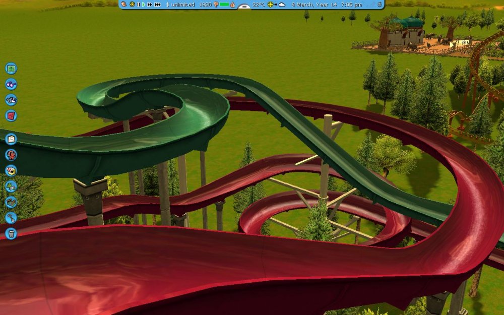 Here is a new park I've been working on lately. It's called Uberland! Original name, I know. Lots stuff Id idnt post baout yet. Keep checking in! The Safari Tour Train Station Danger Zone Another shot of the Toboggan Another view More of the park's slides Overview shot of it Hurricane, the park's Master Blaster Looking up at some of the slides The midway on the wya to the waterpark is quite the crowded one. Overview from the water park You can't see it to well here but on it's famous close-to-the-path, close-to-the-water turnaround, there are water jets that come up However thef irst drop might not be based on the one of them you might expect it to be. Next up is Fury. It's a mix of Maverick, Expedition G force, and a little somethign extra. And to your left is the park's Toboggan slide. To your right is Danger Zone. The park's Corkscrew coaster. A bit on the rough side but alot of fast paced fun. This is the view as you enter the park