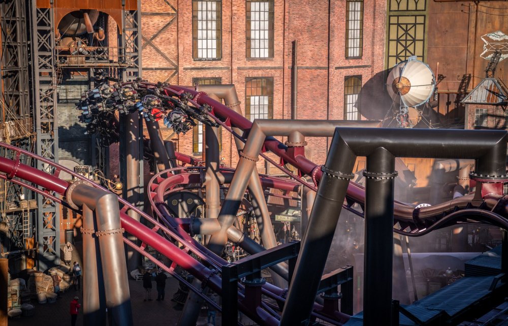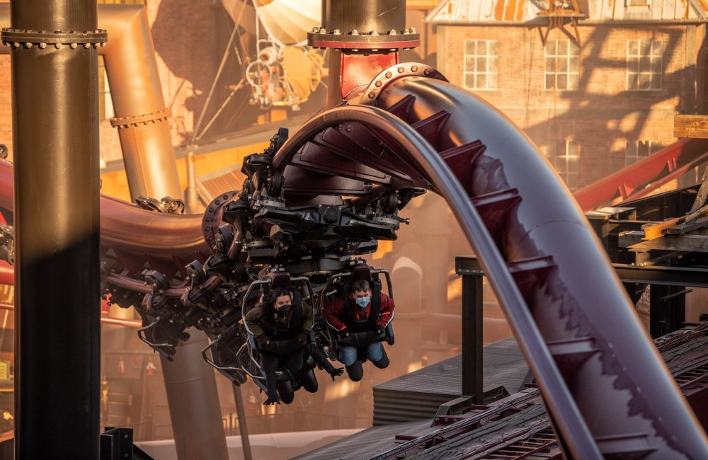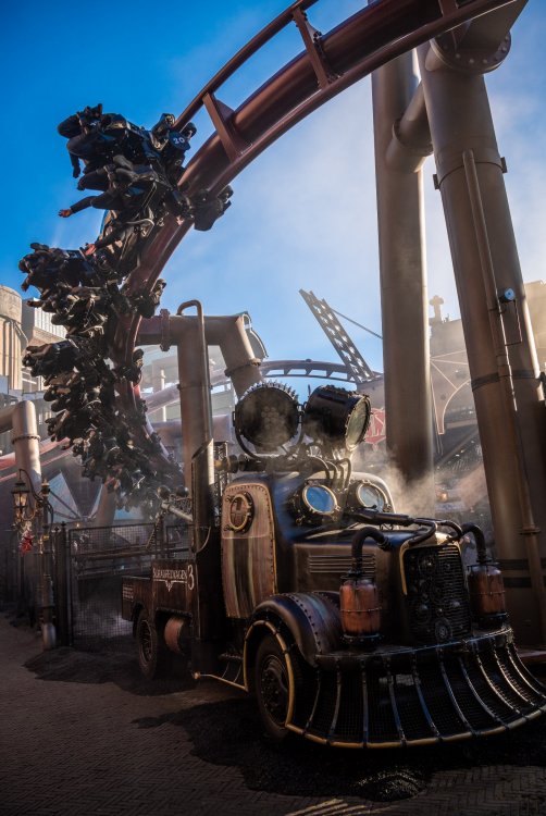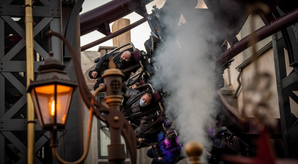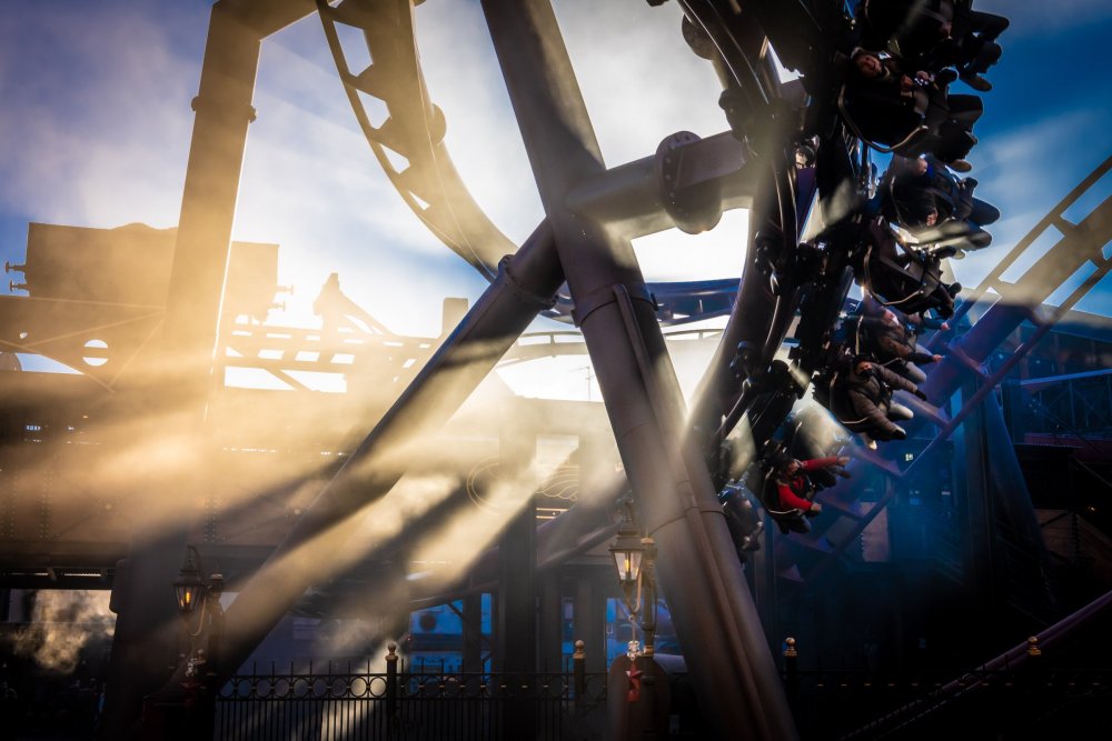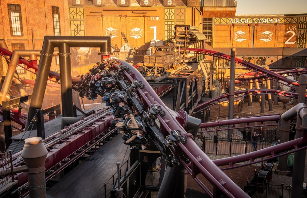 As some regular Theme Park Review readers might know, I live in Bonn, which is not only the former capital of Germany, but also very close to Phantasialand. The park has a solid reputation for building excellently themed roller coasters like the “Colorado Adventure” Vekoma mine train, the B&M inverter “Black Mamba” and most recently the Intamin multi launch coaster “Taron”, embedded in the genuine world of “Klugheim” that opened in 2016. Phantasialand is a family owned park, so it came quite as a surprise that they announced another world class rollercoaster to open in 2020: F.L.Y., located in the new themed area “Rookburgh” – a steam punk type of land. This flying coaster, build by Dutch manufacturer “Vekoma” features 0.75 miles of track, two LSM launches, a “dark ride” part, two inversions and the most innovative loading system I have ever seen on the flying coaster: to enable riders to board, the track is mounted against the station wall and the seats are rotated 90°. To put passengers into the “flying” position, the seats rotate back seamlessly after the ride has passed the short “dark ride” section. The whole setting of the attraction is amazing: steam emerges from the underground, there are tons of details and the sound design creates a perfect immersion. But it is at night, when “Rookburgh” really shines. A visit during the “Wintertraum” event is greatly recommended, as the park stays open late and there are little to no wait times – even at top attractions like F.L.Y., Taron and Black Mamba. The steam effects and the low winter sun make for some cool "god rays" The coaster interacts with the elaborate themeing. I really love that shot. Speaking of themeing … They use metal detectors and a clever locker system, so F.L.Y. flies literally over the guests heads. Tracks and trains and winter sun and blimps and Vekoma goodness This inversion makes the cars look like a petal. Pier 5 Just one of many "airtime" moments. And yes: that's ice on the top of the backbone. 30°F. A panoramic view of F.L.Y. and the whole "Rookburgh" area. Pretty, uh? To the left you can see the first straight LSM launch segment. For the real enthusiast, there is a capsule style hotel embedded into "Rookburgh": "Charles Lindbergh" gives guests some exclusive views of "F.L.Y." (as the trains literally travel around your rooms) and front of line access. I did mention the excellent themeing, didn't I? It's all about flight. They might not completely follow german mask policies, but at least those girls seem to have fun. They do way better (as most of the guest do) One of the infamous steam effects. This gauges turn red before those effects go off. Did I mention the themeing? I'm pretty sure, I did. And there is lot of it. When the sun sets the whole area becomes even more "magical". After sunset. That's some impressive view, isn't it? They even do a short "light show" when the lighting turns from "day mode" to "night mode". Another panoramic view of "Rookburgh". Track and lights and steam. This is the second launch stretch. It catapults you upward.