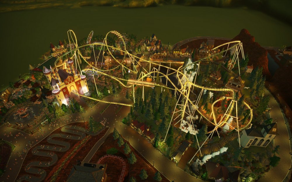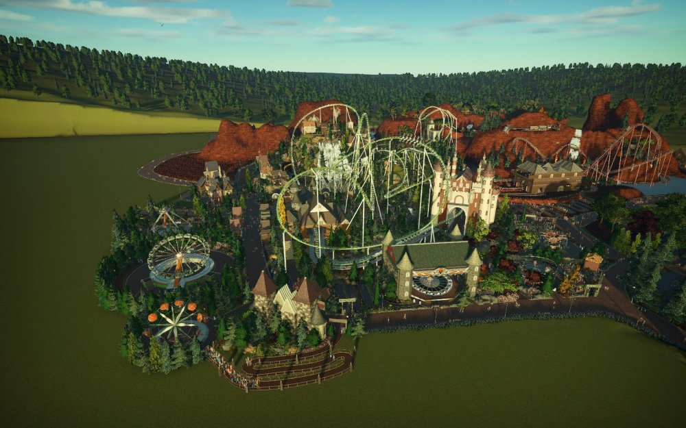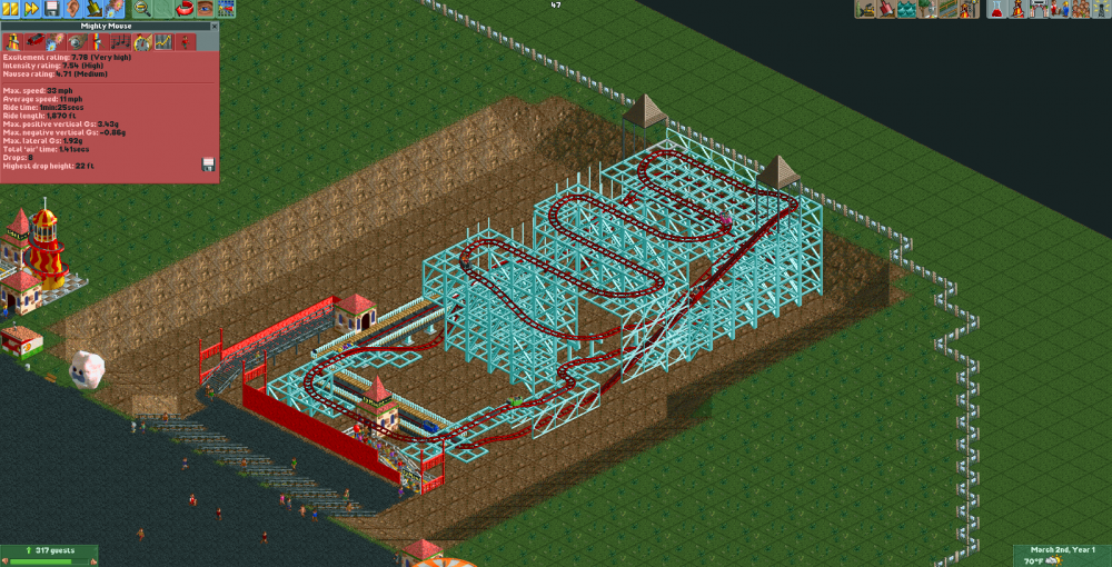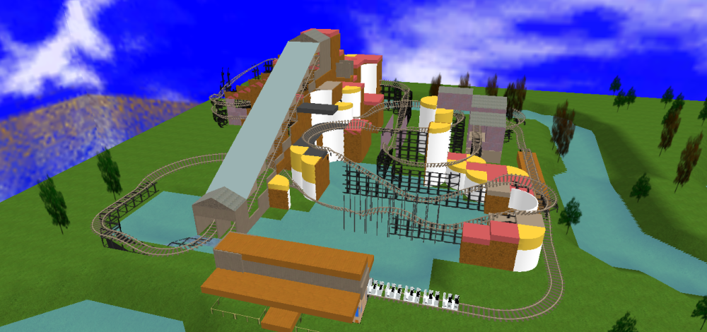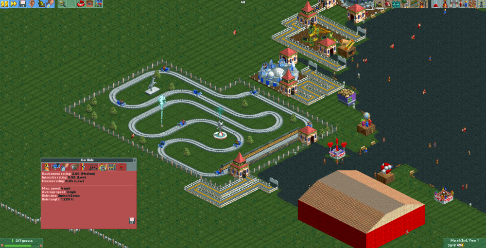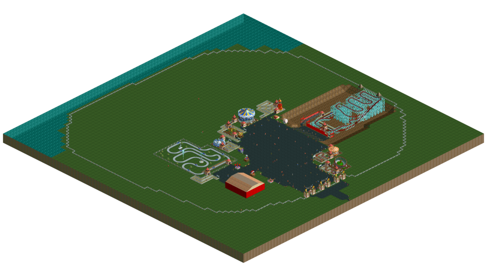 Hello Everyone! My name is ActingEarly and this is my first ever post on TPR, here to show you my new RCT2 park, Diamondwood! I've followed several RCT2 threads on this website over the years, but I've never posted one myself. Well, I've got a new PC, a small break from college, and motivation that somehow magically appeared in the last couple of weeks, so I used them all to put together what may be weight for weight the best beginning to a RCT2 park I've ever constructed. This is a NCSO object park, but I will be using some downloaded flats, stalls, and maybe a custom coaster or 2 (because you tell me to make a park without my Chairswings and Dippin' Dots). Now, because I just seem to be a campy individual by nature, I have to have a story behind my parks. This one's tale is that a fortunate entrepreneur in my home state of Arkansas acquired a large span of mostly flat land in the Ozark Mountains (a feat in itself) and decided to follow his dream of building a massive amusement park in his home state, who's tourism industry probably couldn't support a park that big, but we don't care! This park will have multiple themed areas, something I usually don't include in my parks but will in this one, and I really want to incorporate the location of the park into most of the theming. The current only open section of the park, Diamondwood Square, is an Americana-style entrance area with shops, stalls, restaurants, and classic rides to invite guests to what will eventually be a massive park spanning our entrepreneur's hole in the Ozarks. The area admittedly has pretty loose theming, but said theming will be much more tightly incorporated into future areas of the park. Comments and criticism welcome, as this is my first park here, and let's get to the screens! (Sorry if the picture quality isn't the absolute best in the world, I did what I could. This park is made on RCT2 classic, not OpenRCT2.) Park Entrance and Ticket Building. Sorry about the dead flowers Alternate angle of park entrance and the Season Pass building. The main area of Diamondwood Square. Featuring Diamond Star Carousel, the Overlook Ferris Wheel, and Castle Arcade, a themed Motion Simulator. Sorry for the sheer number of peeps, I have over 1,500 of them in this one little area of the park and it felt a bit empty when I just made them invisible. Another angle of the area that better shows off Yarnell's Creamery (Arkansans know) and Jerry's Famous Burgers. Please excuse the nothingness behind Shooting Star, the big white woodie. The Coliseum Show Theatre, quite possibly my favorite RCT2 building that I've ever made. Angle numero dos of the Coliseum and the bathrooms attached to its left. Also a slightly better shot of Whirling Dervish, the Tilt-a-Whirl. A parking lot that I totally didn't just make to fill up space, why do you ask? The second half of Diamondwood Square, centralized by a pagoda that houses an info kiosk. The Junk Depot Gift Shop, a.k.a. the brownest building to ever brown, nestled in front of the Arkansas Railroad miniature railway, which will be a big help once the park starts getting bigger. Also featured is Castle Jon's Pizza, another personal favorite building of mine, and the Aerial Chariots Chairswing (please excuse those no-entry path signs, as well as the chunk of wall I just now realized was missing from Arkansas Railroad's station). And here's the station for Shooting Star, currently the biggest crowd-pleaser in the park (but hopefully not for long ). Upon my last visit to Silver Dollar City, I noticed most of their coasters had small gift shops attached to their exit routes, so I tried to incorporate that a bit into Shooting Star's station. Another angle of Shooting Star that shows off the first drop. I honestly tend to struggle a bit when it comes to making good-looking coaster layouts in RCT2, but I'm really happy with how this one turned out. It also makes a great backdrop to Diamondwood Square. Thank you all for reading! Hopefully I'll have another update out before too long, but I may have to wait until college lets out for summer if I want to avoid two or three-pic updates.
