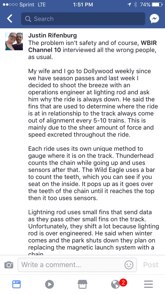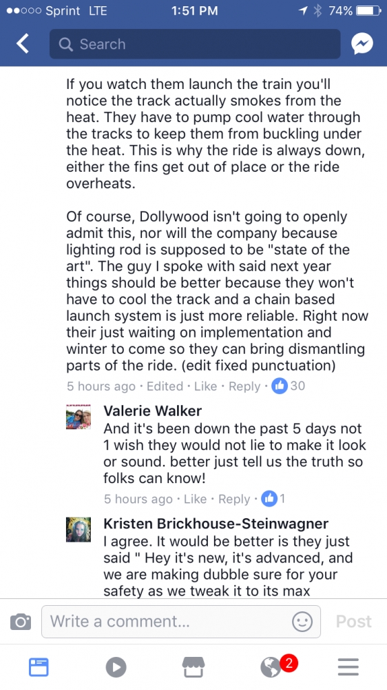 ^ Yet, I feel that a lot of the general public are still talking down on the coaster more so than we may think. A good example is found in the facebook comments on a latest WBIR article talking about the coaster being down more than open. The article interviewed Pete Owens, which he stated that the coaster is running more consistently than last year, which we pretty much knew already. At the same time, I do feel like a lot of others are making the ride's issues sound worse than they really are, and this was mentioned earlier in a previous post.