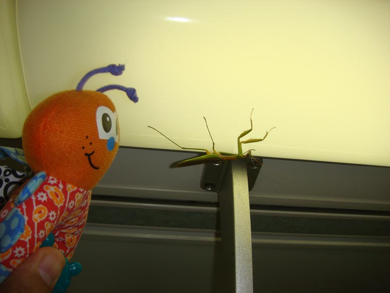 "Hello scary giant green bug...I am going to EAT YOU!!!"